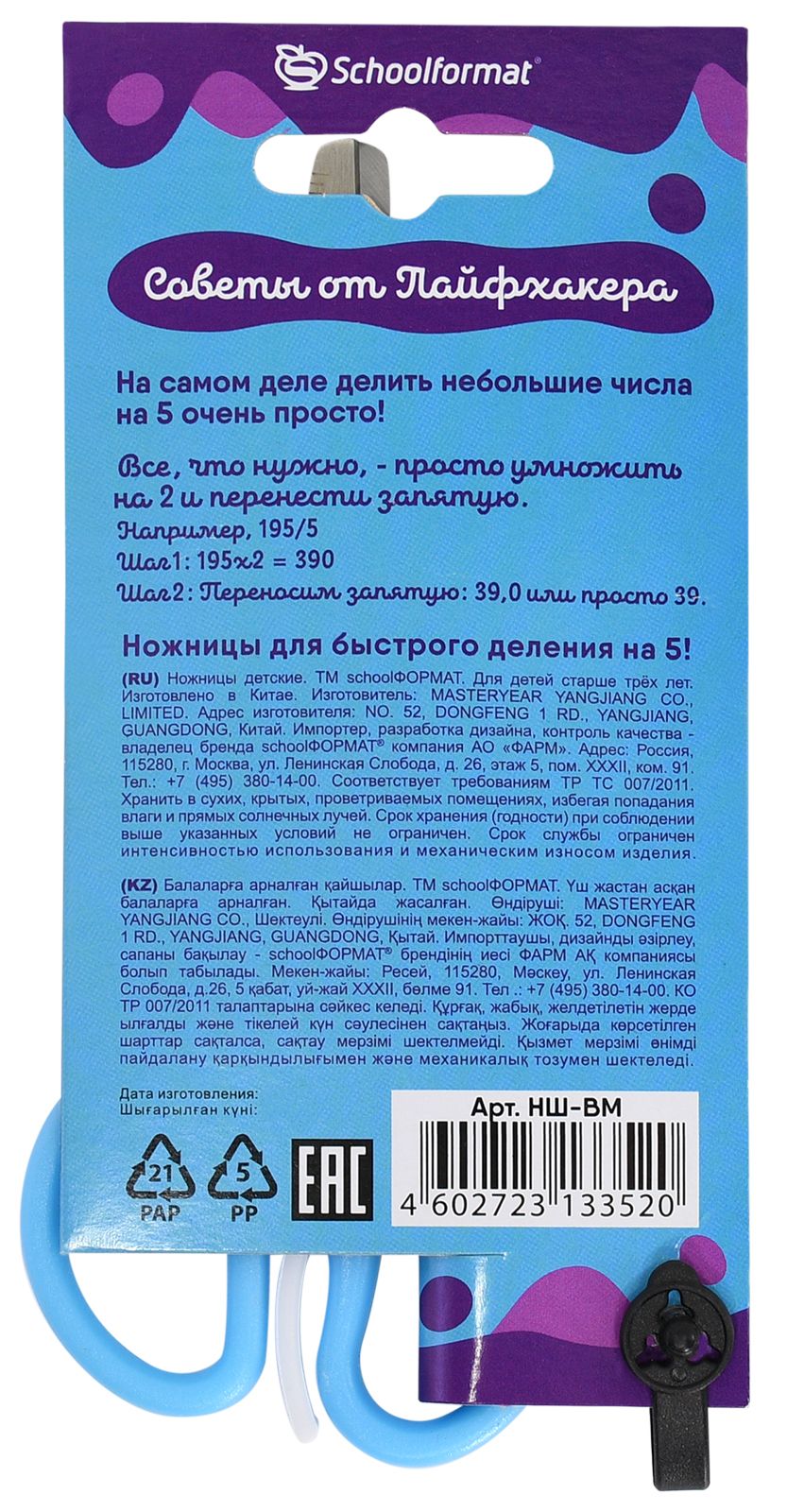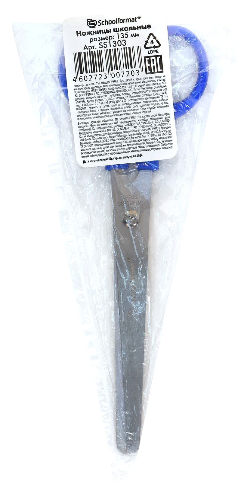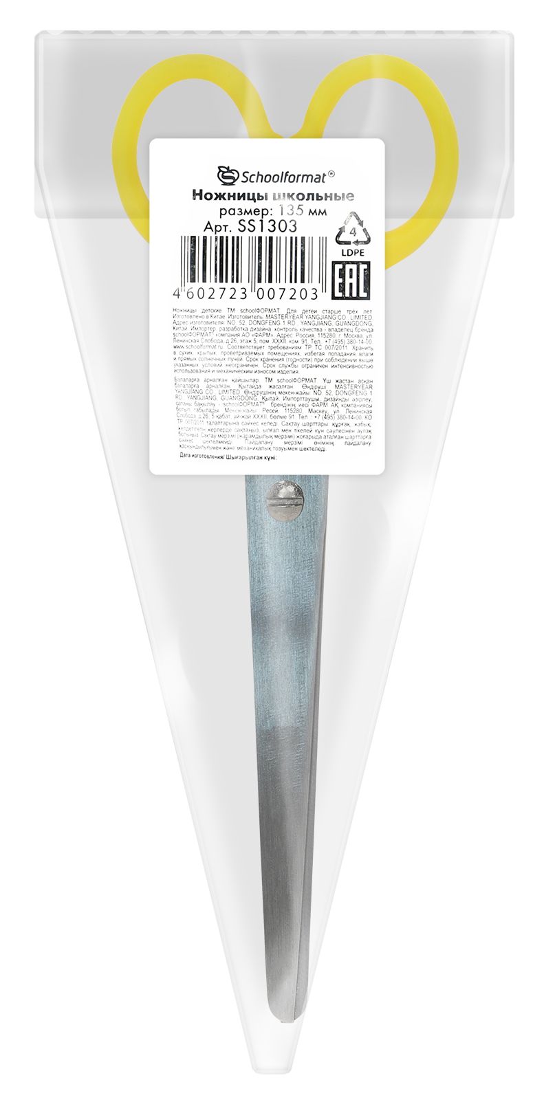Наличие фиксатора: Нет Наличие европодвеса: Нет Упаковка: пакет Подходит для левшей: Нет Длина ножниц, мм: 135 Длина лезвия, мм: 93 Мин. партия и варианты упаковок: 1 / 24 / 480 Ножницы школьные Schoolformat безопасные 135 мм, ручки пластиковые