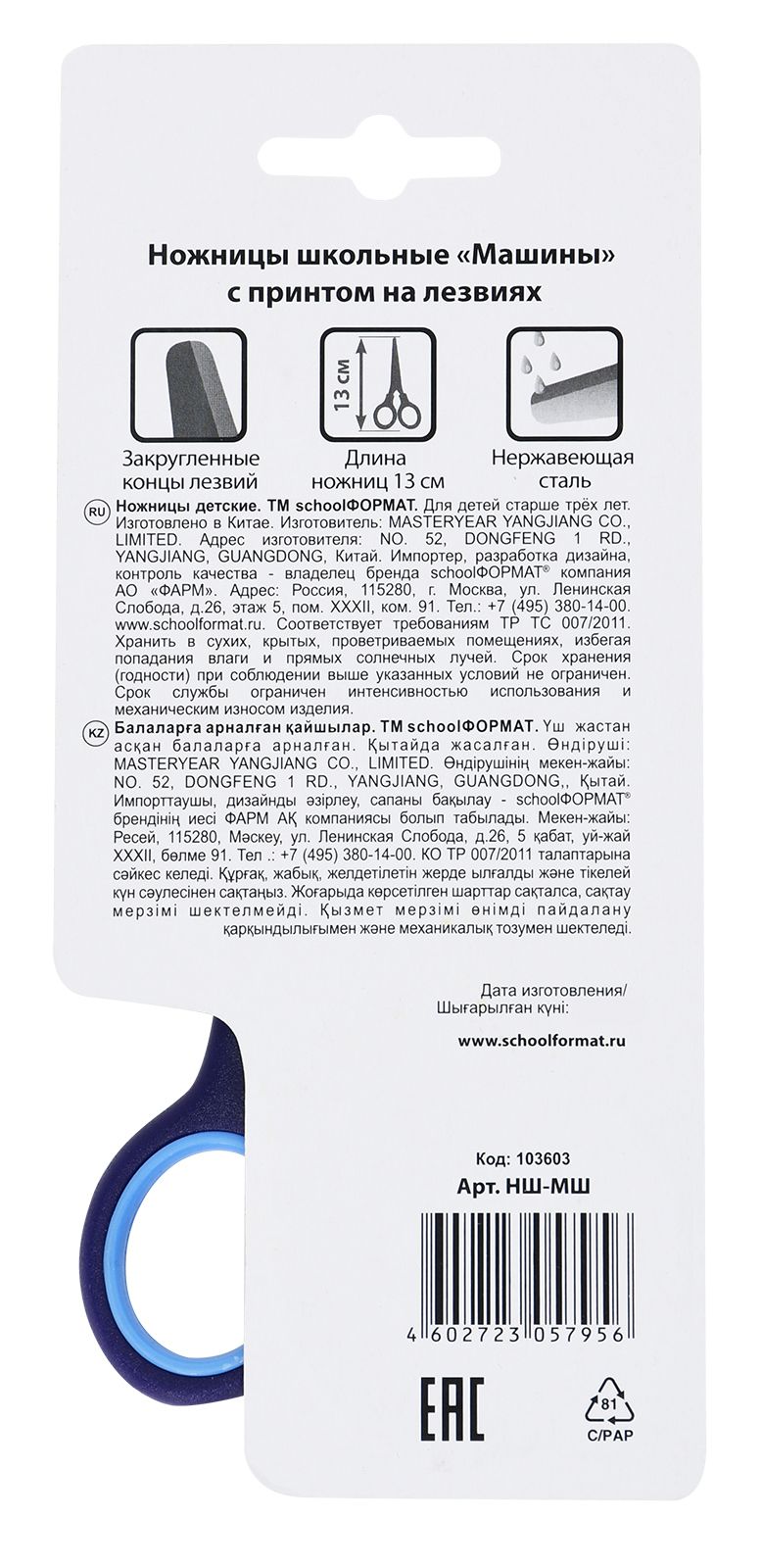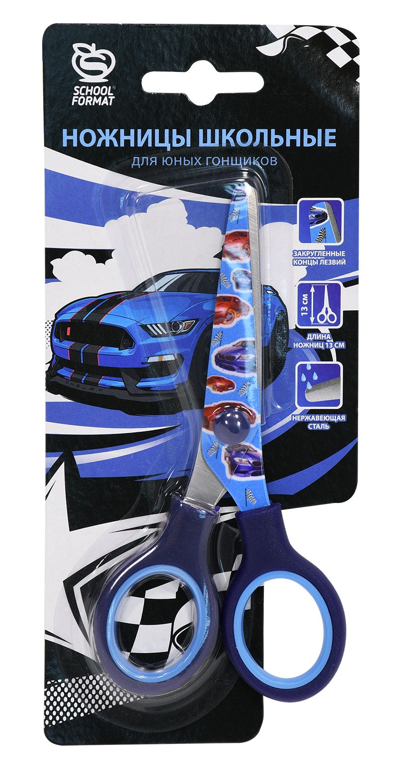 Цвет: голубой Наличие фиксатора: Нет Наличие европодвеса: Да Упаковка: блистер Серия: МАШИНЫ Подходит для левшей: Нет Мин. партия и варианты упаковок: 1 / 12 / 240 Ножницы школьные Schoolformat МАШИНЫ безопасные 130 мм, ручки пластиковые с резиновыми вставками голубые, синий с принтом на лезвиях