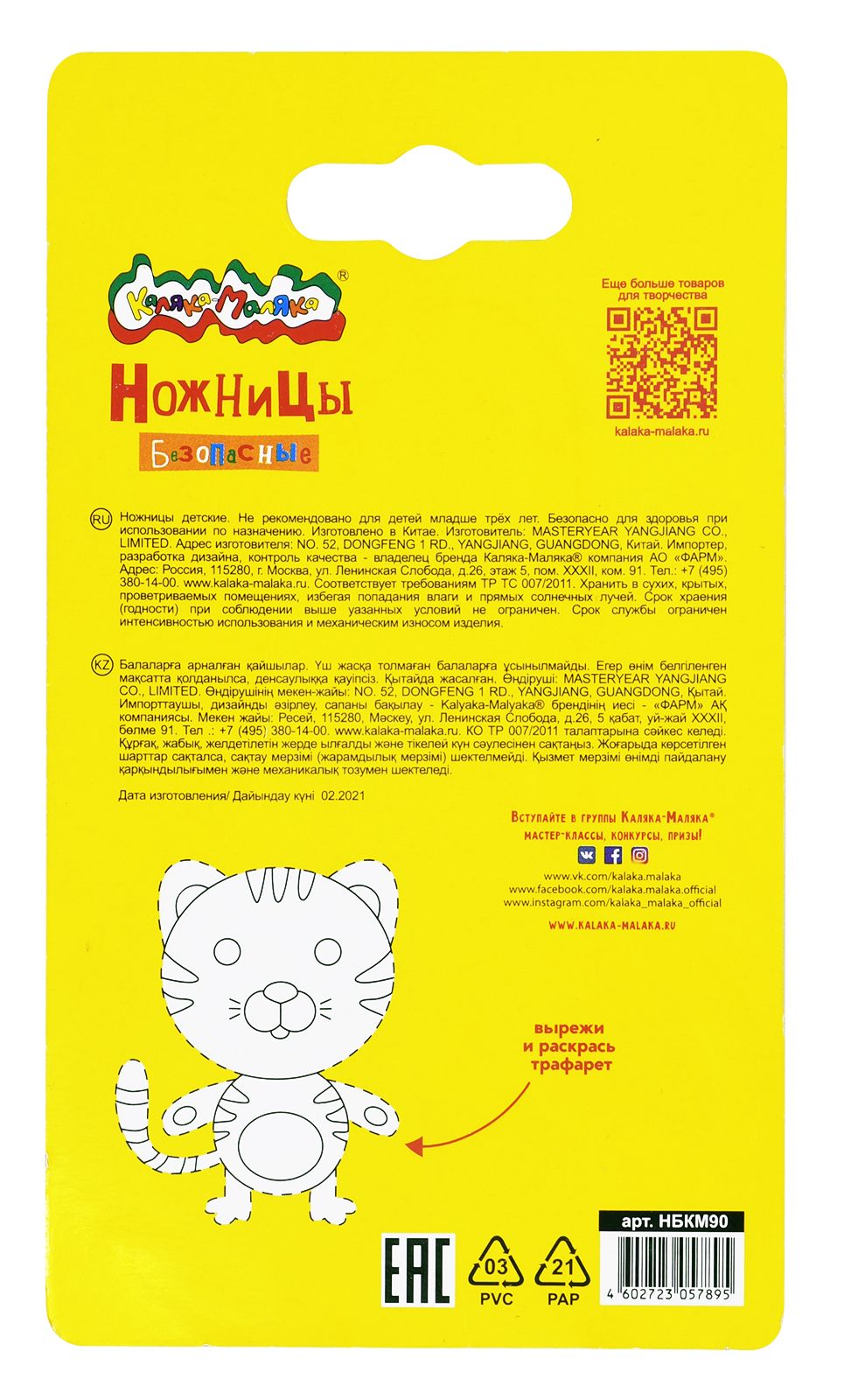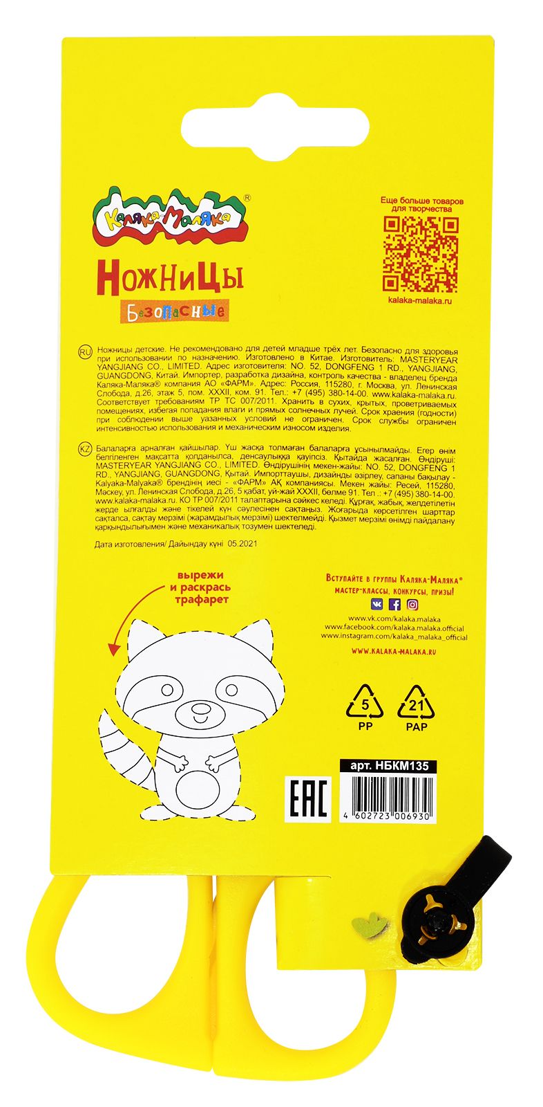 Цвет: желтый Наличие фиксатора: Нет Наличие европодвеса: Да Упаковка: блистер Подходит для левшей: Нет Длина ножниц, мм: 90 Мин. партия и варианты упаковок: 1 / 24 / 480 Ножницы детские Каляка-Маляка безопасные 90 мм, ручки пластиковые желтые, лезвия металл+пластик