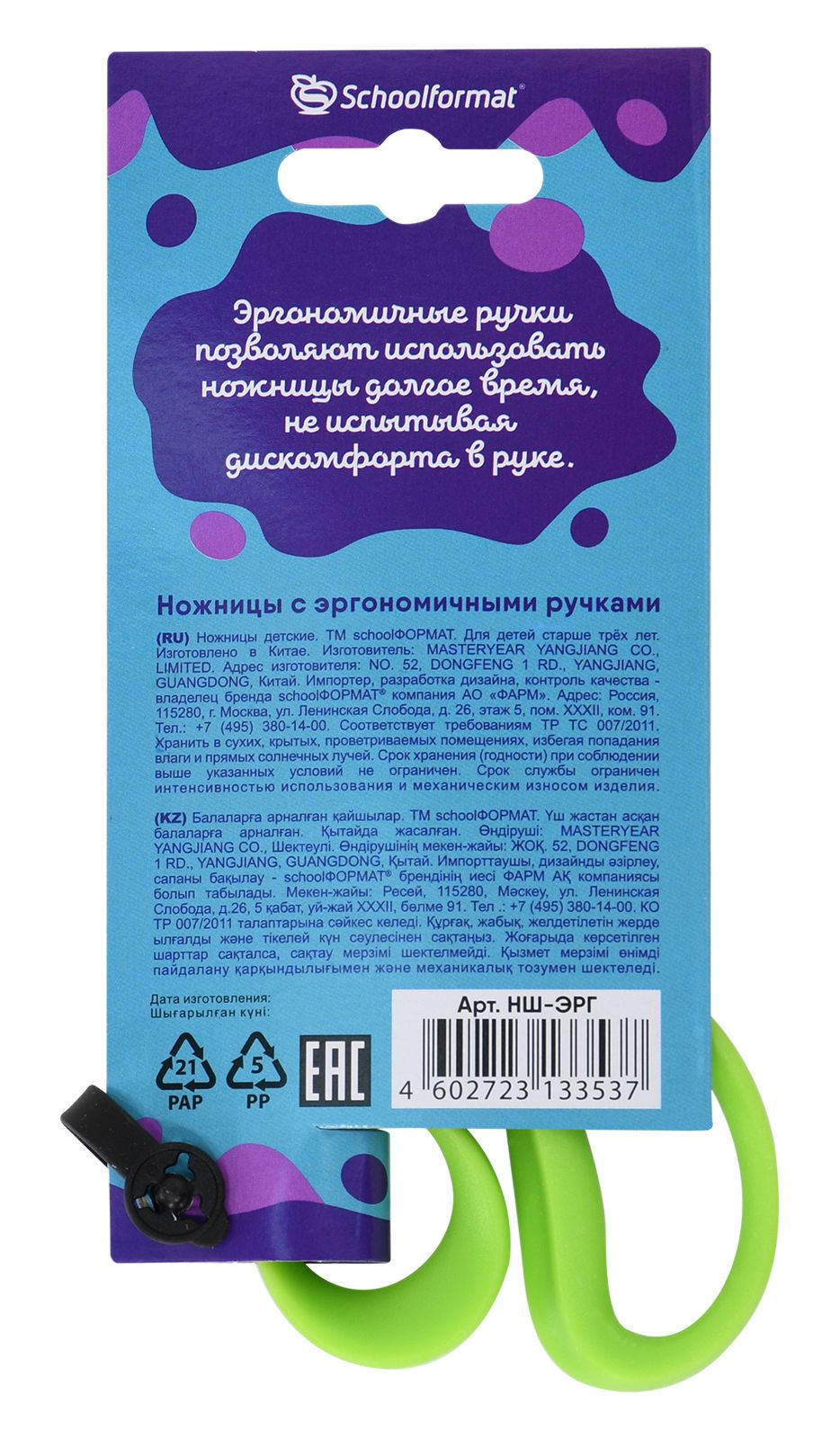 Цвет: зеленый Наличие фиксатора: Нет Наличие европодвеса: Да Упаковка: картонная упаковка try-me card Серия: ПОХОД Подходит для левшей: Нет Мин. партия и варианты упаковок: 1 / 12 / 288 Ножницы детские ПОХОД безопасные 135 мм, эргономичные ручки пластиковые зеленые, с усилителем, лезвия металл+пластик