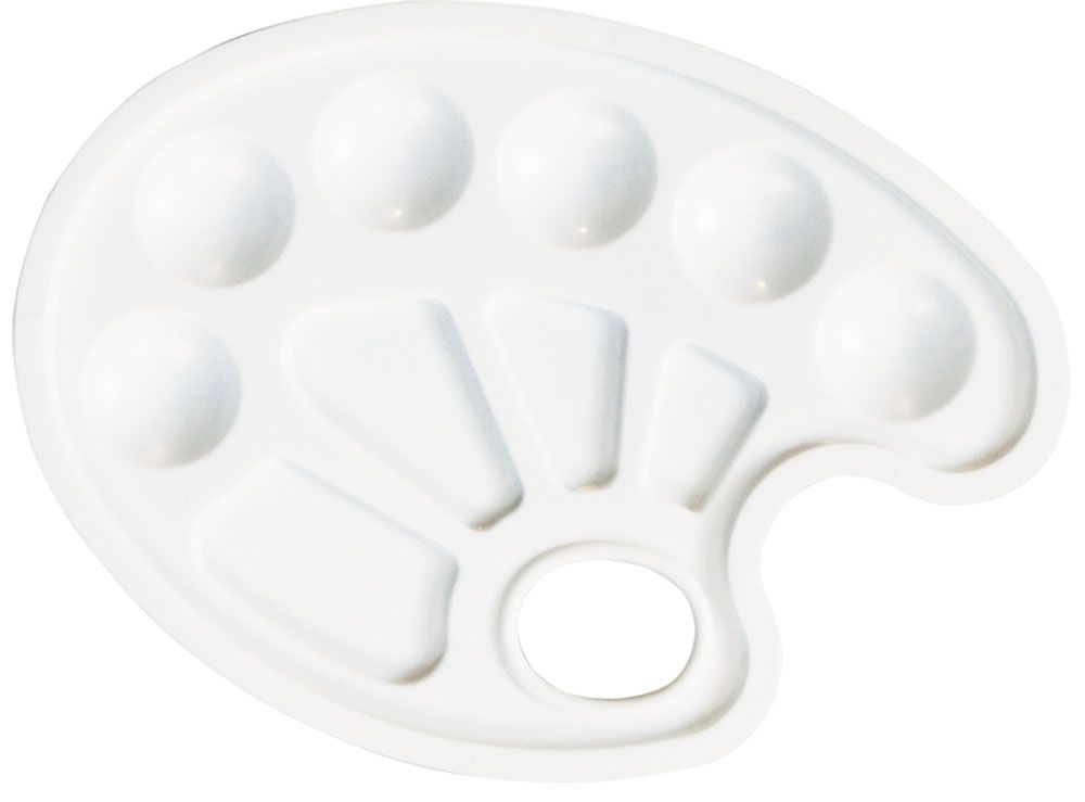Классическая овальная форма. Изготовлена из прочной пластмассы, выдерживающей растворители. Хорошо подходит для работы с масляной краской. Наличие отверстия под палец, чтобы было удобно держать палитру в руке.