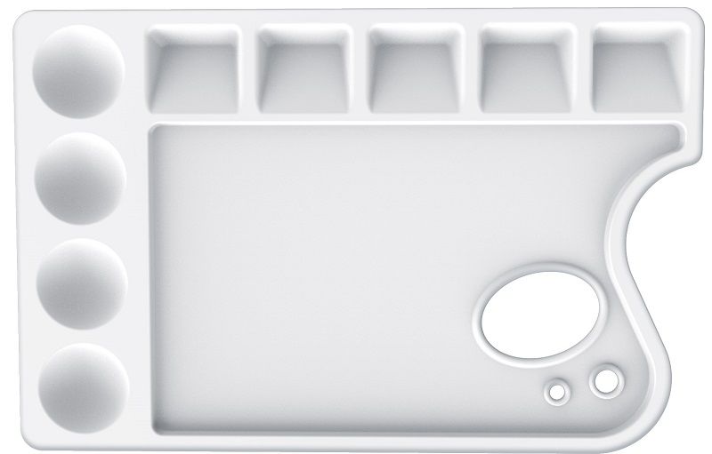 В палитре имеется отверстие для большого пальца руки, ячейки круглой и прямоугольной формы для красок и площадка для их смешивания. Закруглённые углы для безопасности использования.