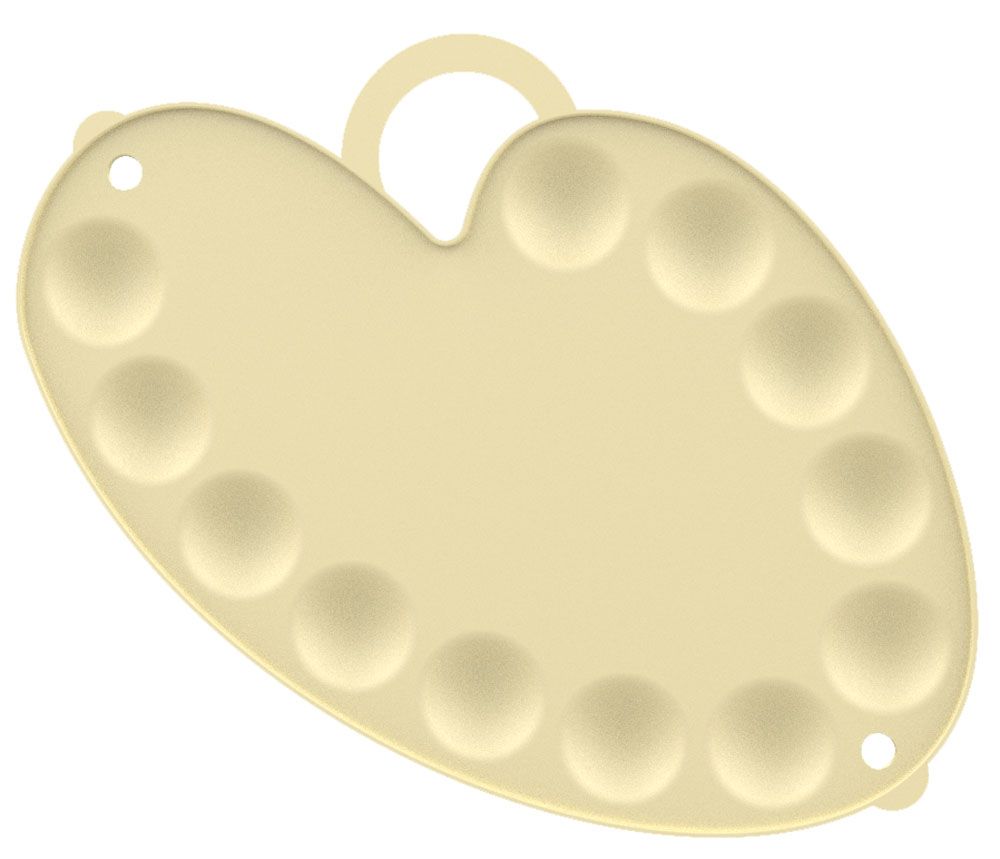 Палитра - необходимое приспособление для занятий живописью. Предназначена для организации и смешивания цветов. Изготовлена из прочной пластмассы. Подходит для работы с акварелью, акриловом, гуашью, темперой и масляными красками. Имеет отверстие для пальца.