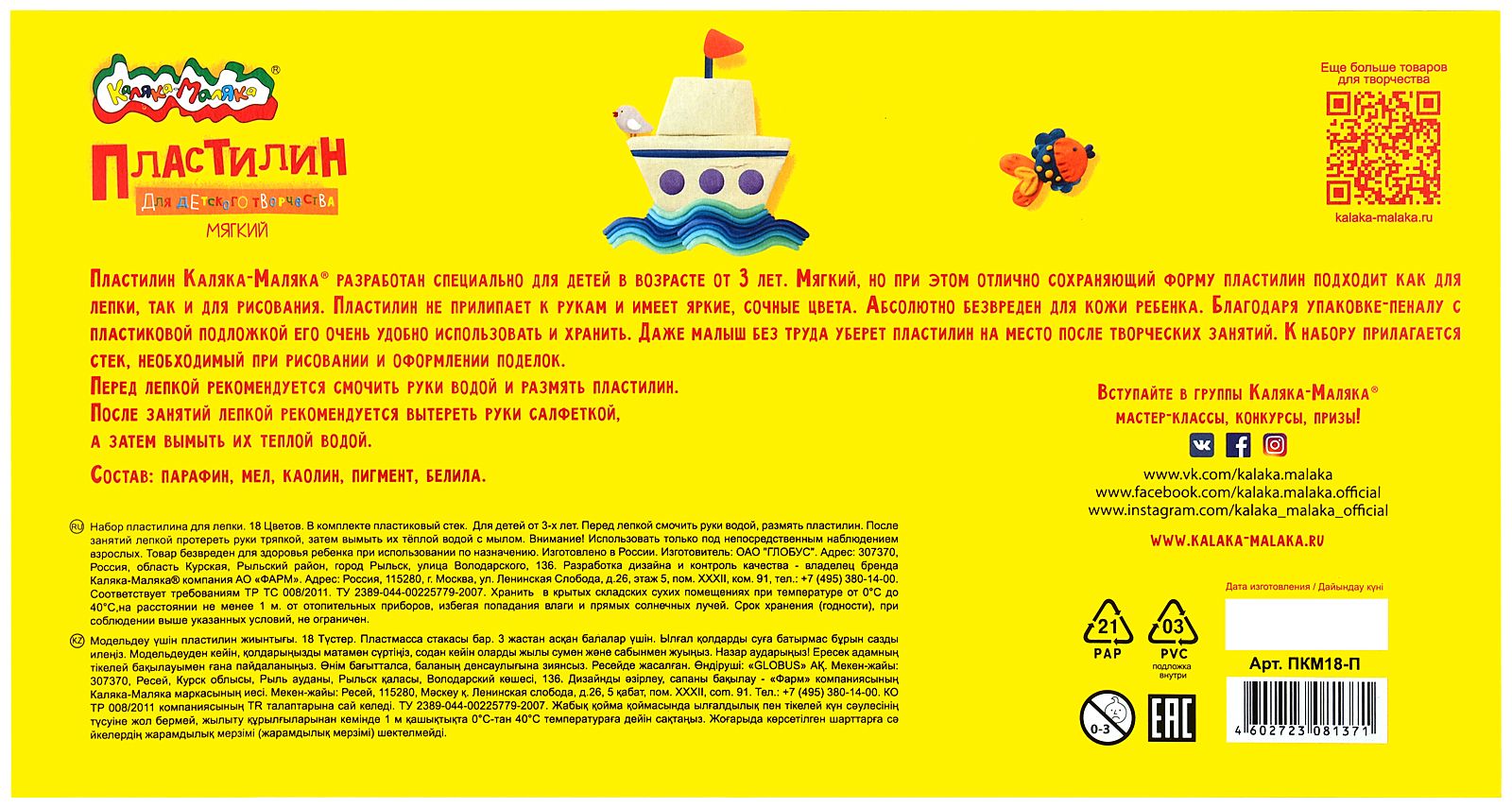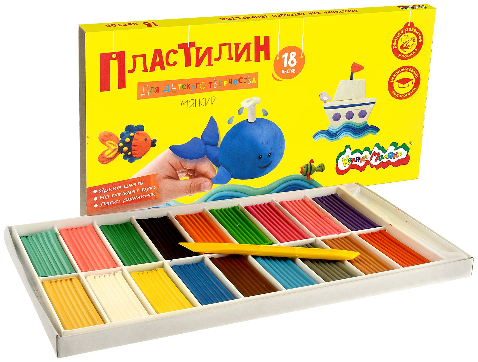 Цвет: ассорти Количество цветов: 18 Наличие европодвеса: Нет Упаковка: картонная упаковка Наличие стека: со стеком Набор: Да Мин. партия и варианты упаковок: 1 / 10 Пластилин Каляка-Маляка 18 цветов 360 г ассорти, со стеком
