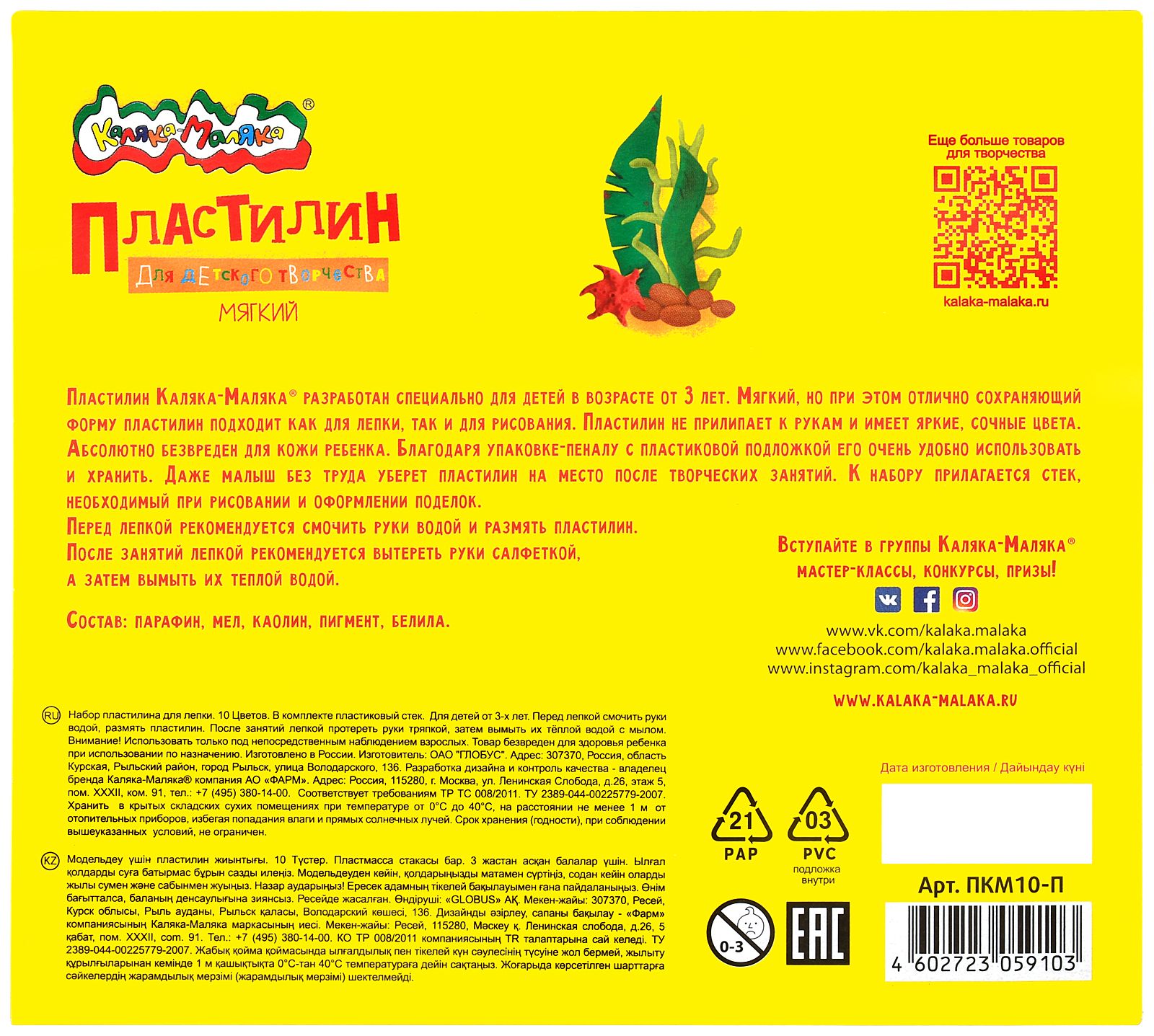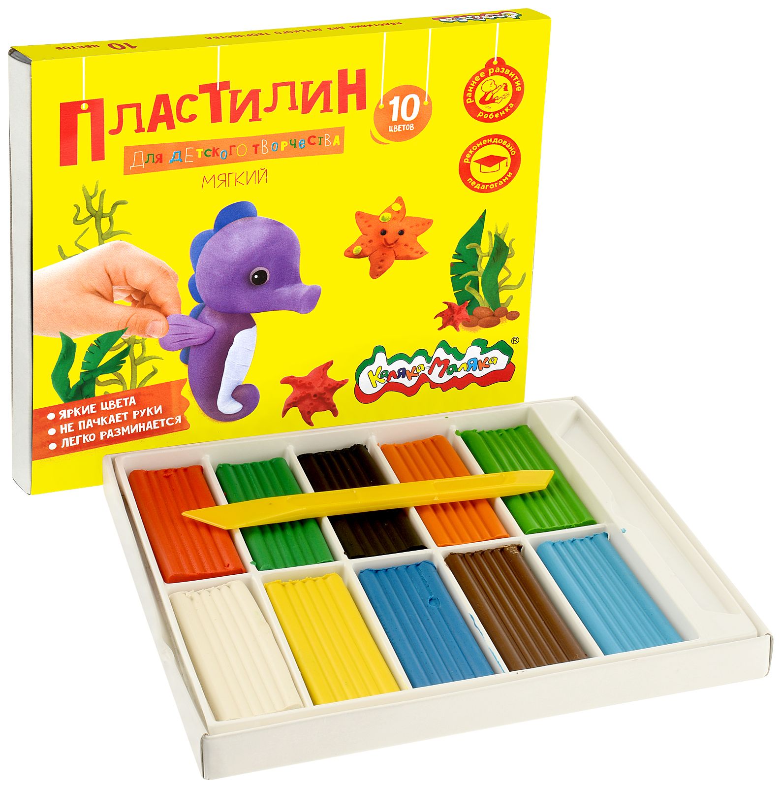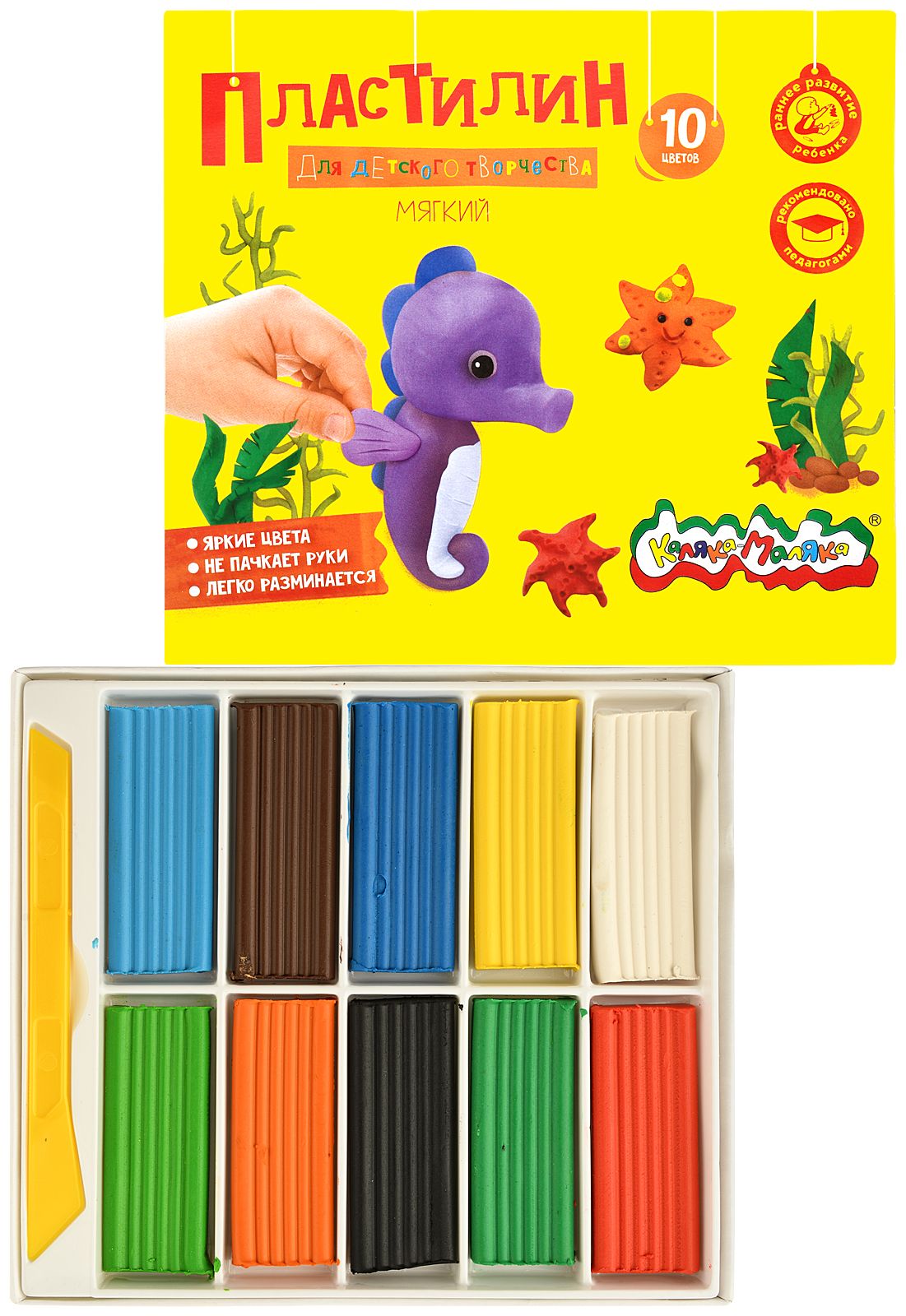Цвет: ассорти Количество цветов: 10 Наличие европодвеса: Нет Упаковка: картонная упаковка с коррексной подложкой Наличие стека: со стеком Серия: ДЛЯ ДЕТСКОГО ТВОРЧЕСТВА Мин. партия и варианты упаковок: 1 / 20 Пластилин мягкий Каляка-Маляка ДЛЯ ДЕТСКОГО ТВОРЧЕСТВА 10 цветов 150 г ассорти, со стеком