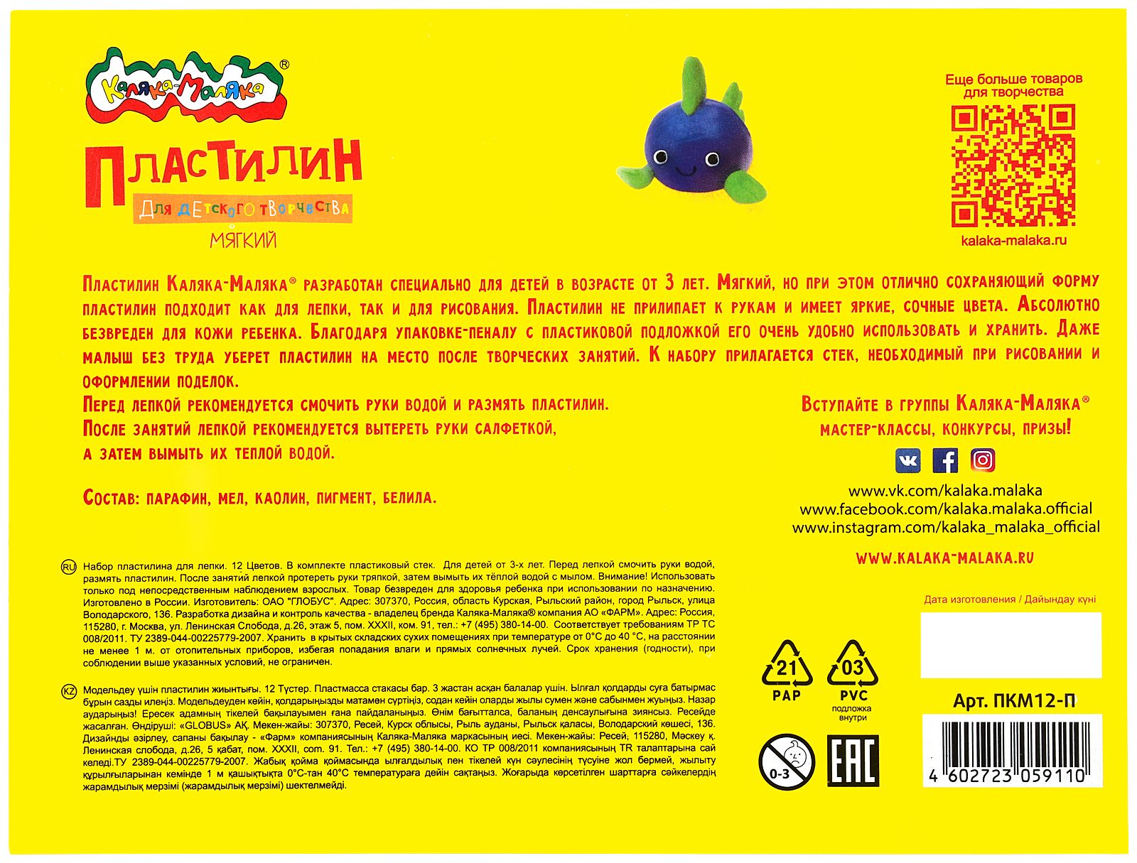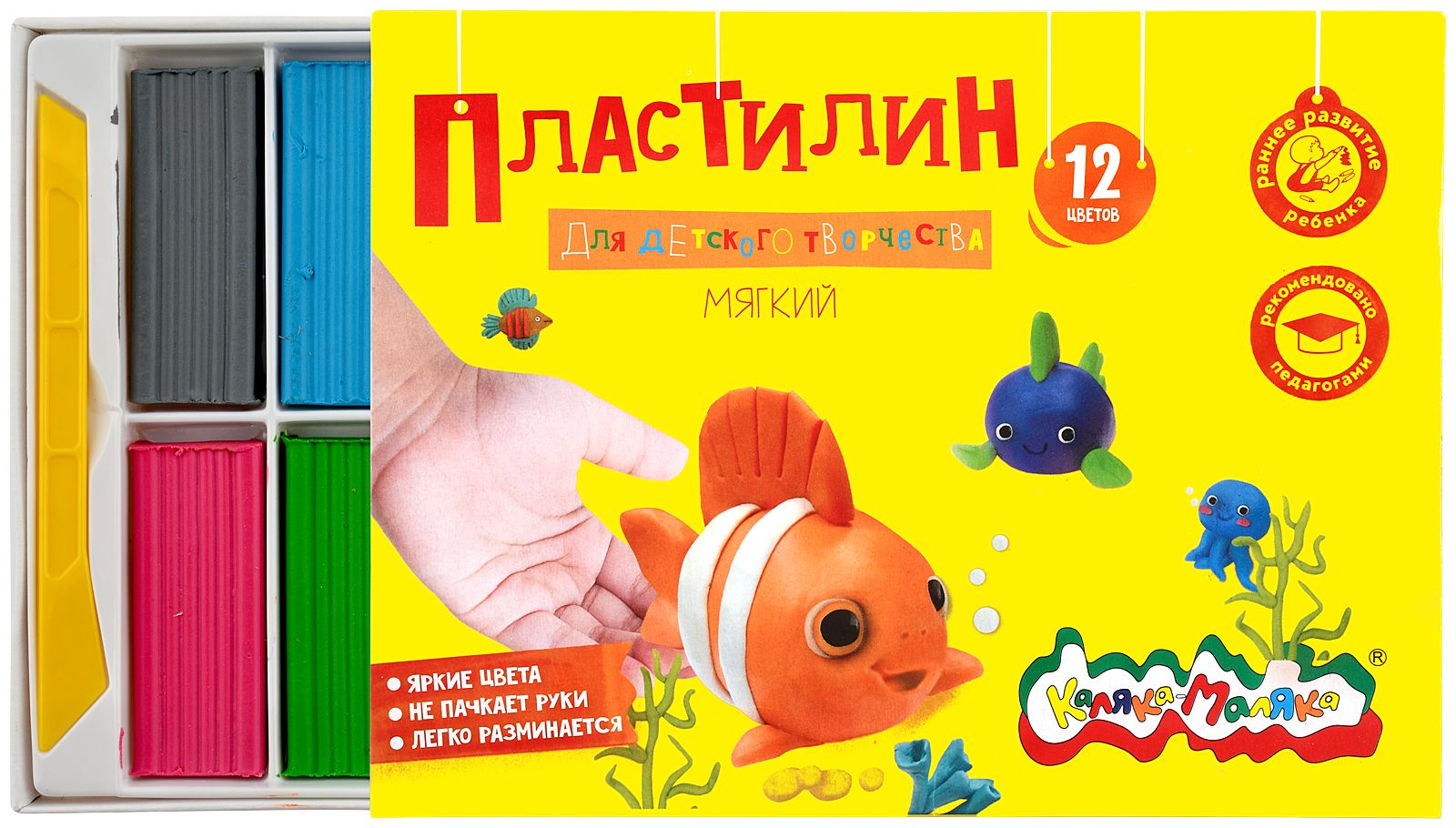 Цвет: ассорти Количество цветов: 12 Наличие европодвеса: Нет Упаковка: картонная упаковка с коррексной подложкой Наличие стека: со стеком Серия: ДЛЯ ДЕТСКОГО ТВОРЧЕСТВА Мин. партия и варианты упаковок: 1 / 20 Пластилин мягкий Каляка-Маляка ДЛЯ ДЕТСКОГО ТВОРЧЕСТВА 12 цветов 180 г ассорти, со стеком