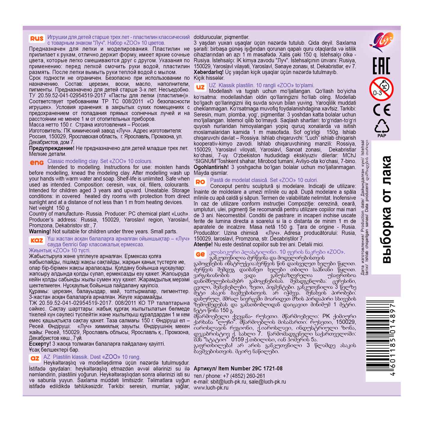 Пластилин Zoo — это традиционный классический пластилин в картонной коробке, в котором высокое качество продукта сочетается с доступной ценой. Безопасность и качество пластилина подтверждаются протоколами испытаний (испытания проходили в сертификационном центре Германии, на упаковке знак CE).