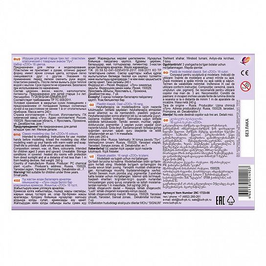 Пластилин "Zoo" — это традиционный классический пластилин в картонной коробке, в котором высокое качество продукта сочетается с доступной ценой. Безопасность и качество пластилина подтверждаются протоколами испытаний (испытания проходили в сертификационном центре Германии, на упаковке знак CE).