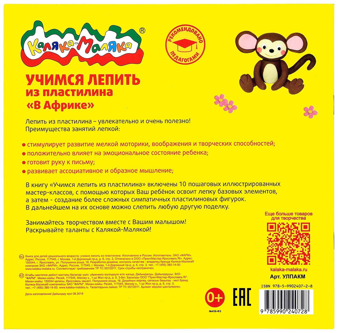 Тип крепления: скрепка Возраст: от 3 лет Вид развивающих игр и пособий: Развивающая книжка Мин. партия и варианты упаковок: 1 / 25 Книжка Каляка-Маляка УЧИМСЯ ЛЕПИТЬ ИЗ ПЛАСТИЛИНА. В АФРИКЕ 10 мастер классов 3+