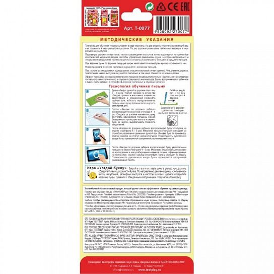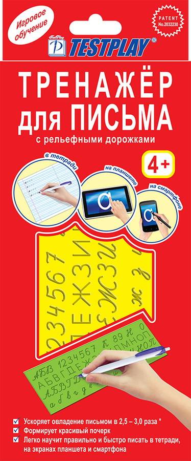 Тренажер представляет собой двухстороннюю пластину с нанесенными в виде дорожек буквами и элементами. Буквы обводят ручкой по дорожке пластины 3 - 4 раза, затем воспроизводят их в тетради.