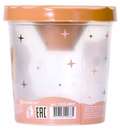 Любимые дизайны и персонажи сквозных серий на стаканах-непроливайках Schoolformat подарят больше вдохновения юным творцам. Стаканы обладают высокой плотностью пластика - 0,9 мм, а объем 250 мл идеально подойдет для использования на уроках труда и технологии.
