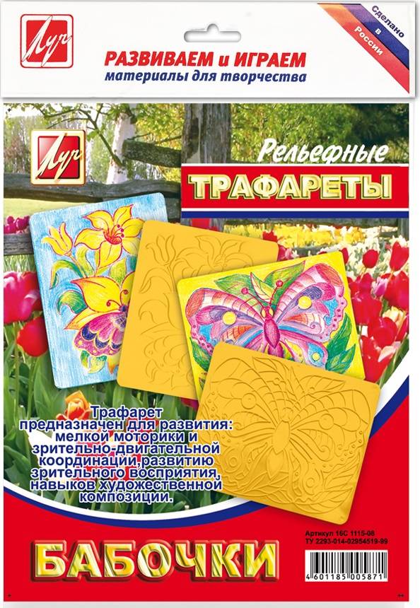 Тематические двухсторонние рельефные трафареты, подобранные с учетом возрастных особенностей малышей, станут хорошим обучающим материалом. Занятия с рельефными трафаретами послужат развитию мелкой моторики рук и подготовки к овладению письмом. Помогут ребёнку получить чёткие, законченные рисунки способствуя развитию интеллекта и художественного вкуса.