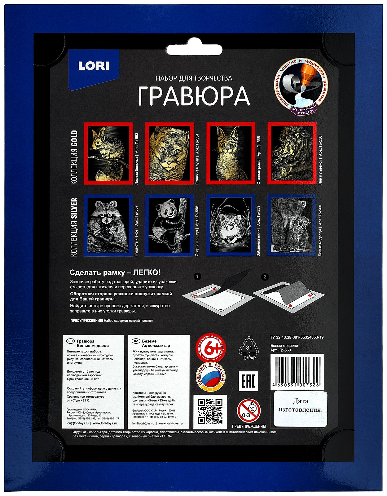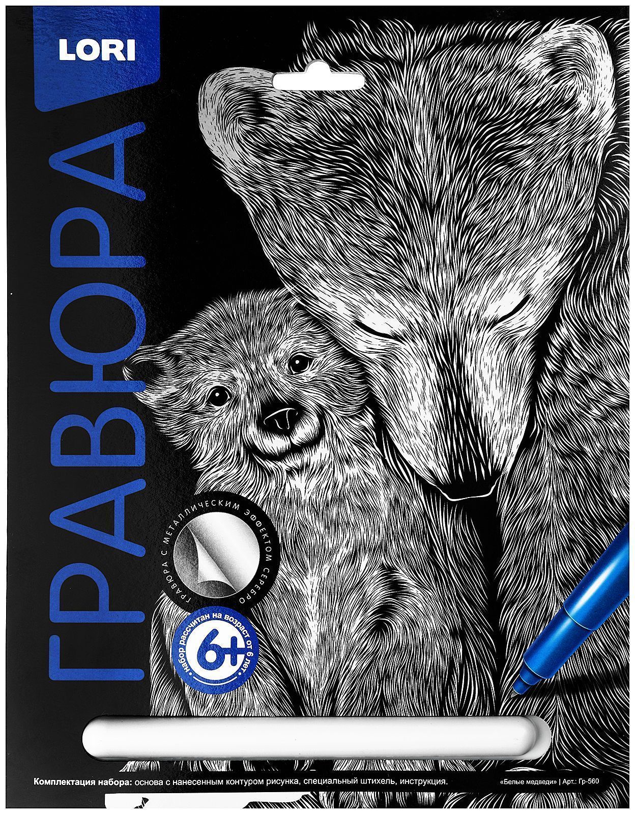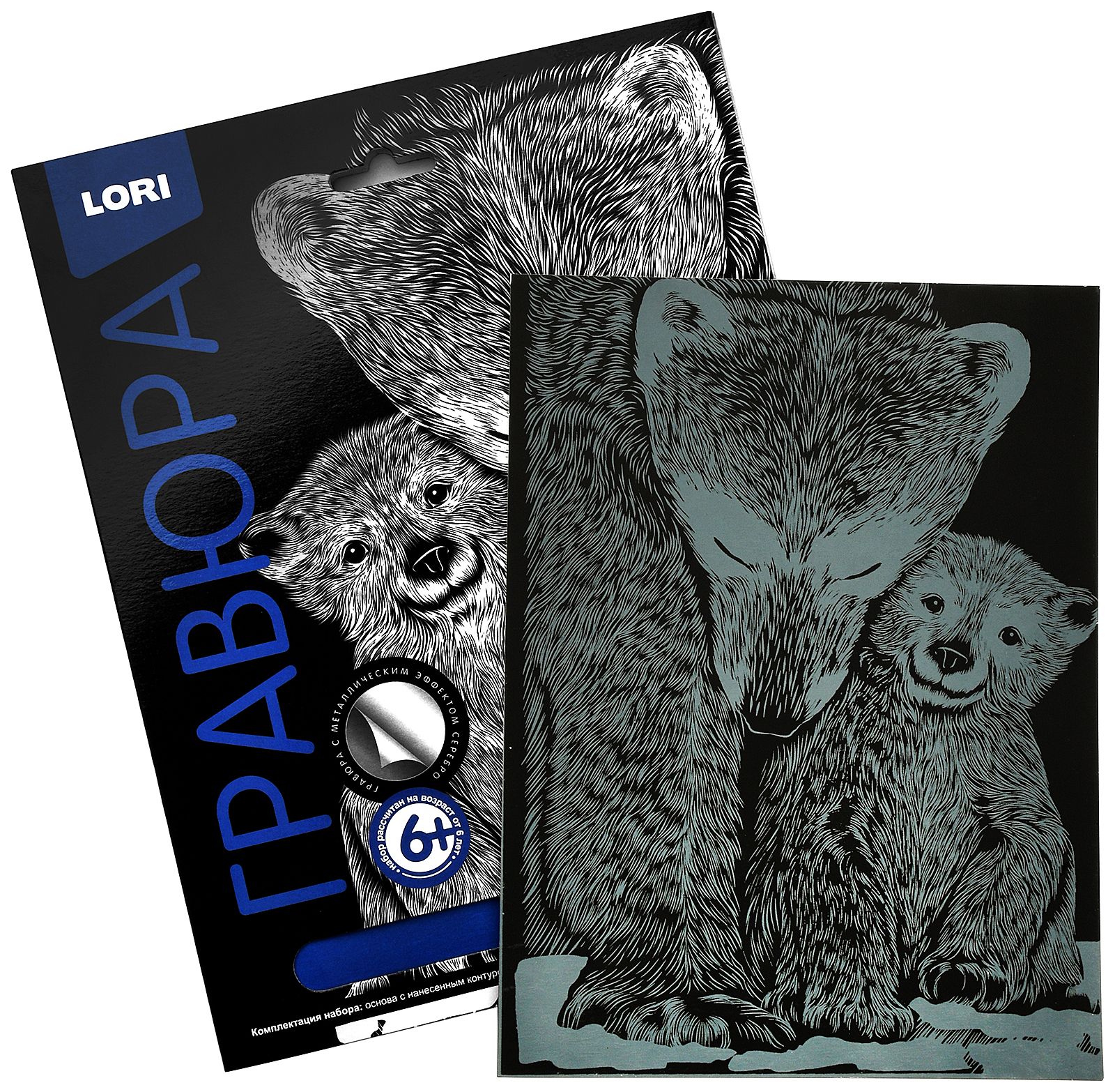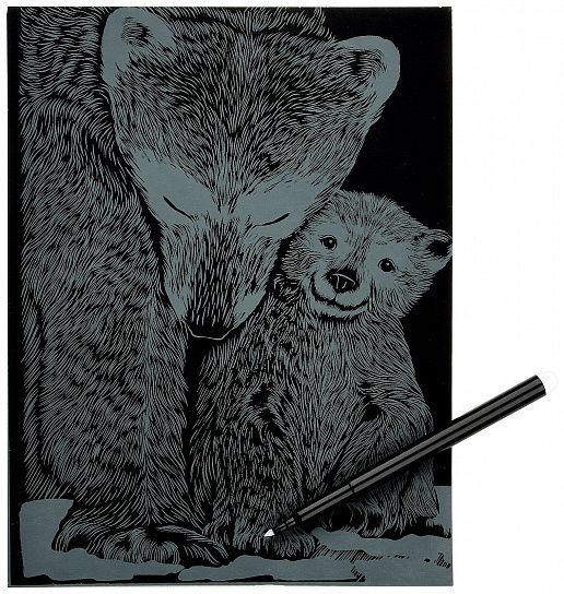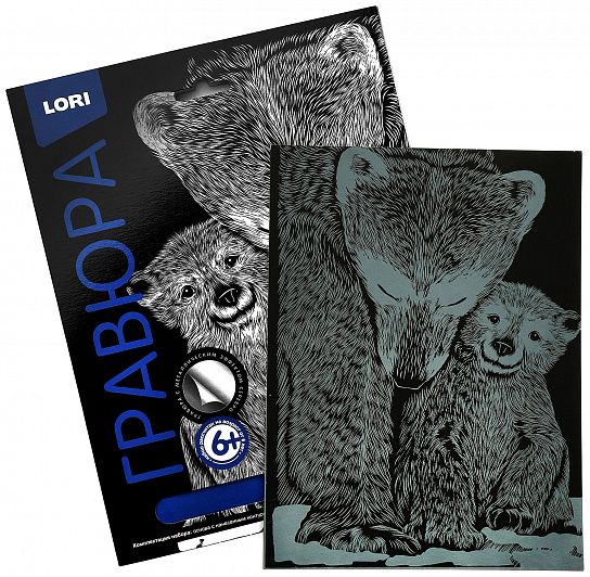 Гравюра - особый вид графического искусства. Сцарапывая верхний слой гравюры специальным штихелем, входящим в набор, ребенок может самостоятельно создать настоящее произведение искусства и почувствовать себя гравером. Готовую гравюру можно вставить в упаковку-рамку.