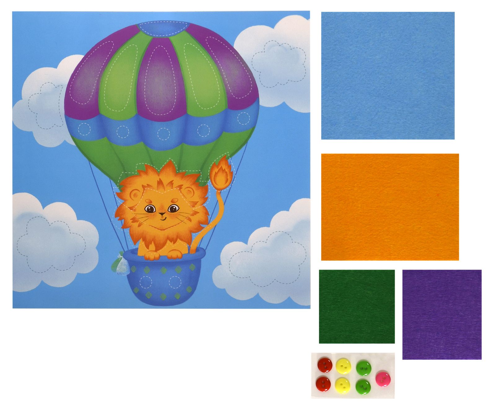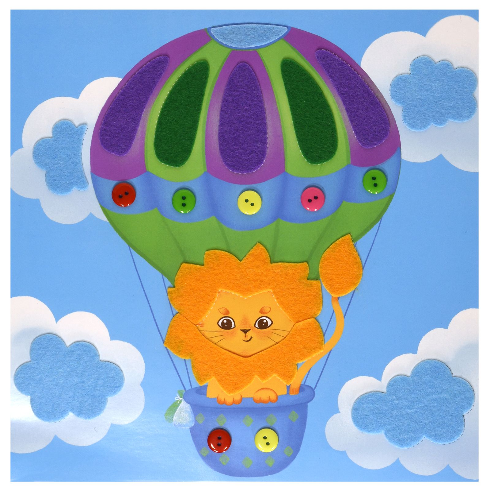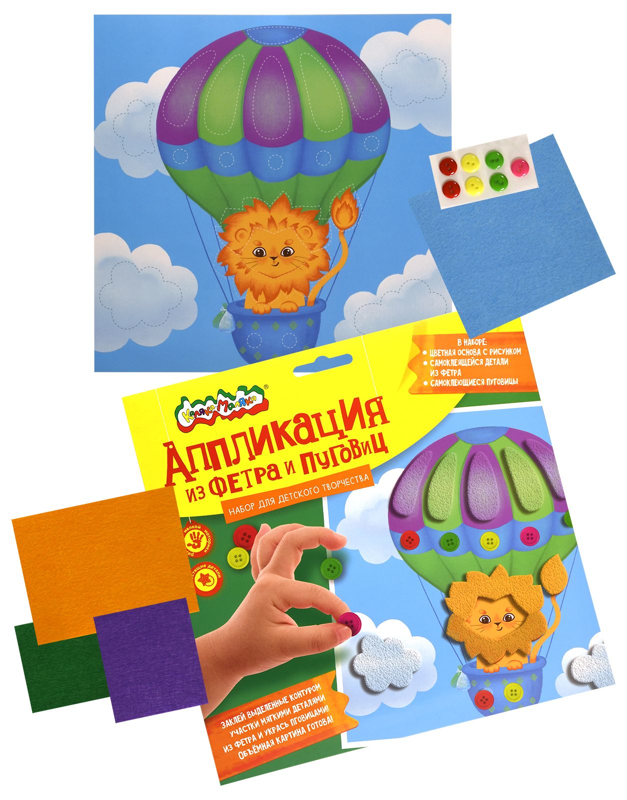 Вид материала для творчества: Аппликация Материал: пуговицы Мин. партия и варианты упаковок: 1 / 100 Аппликация из фетра и пуговиц Каляка-Маляка ЛЬВЁНОК НА ВОЗДУШНОМ ШАРЕ 20х20 см 3+