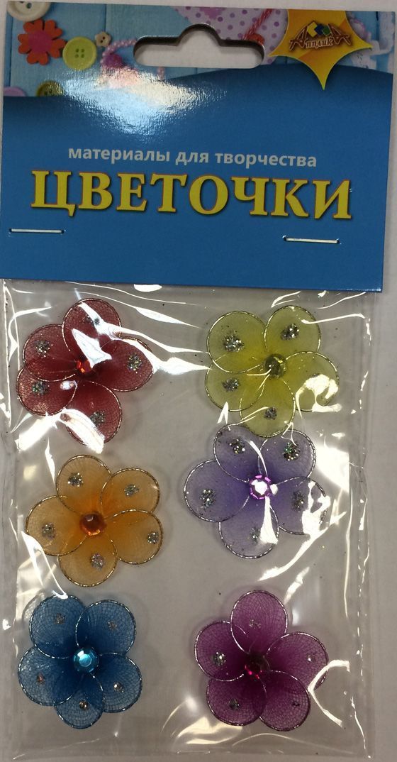Набор для творчества. Цветочки. В наборе 6 цветков, которые сделаны из проволоки и органзы, украшены блестками и стразами. Цветочки имеют двусторонний объемный скотч. Упакованы в ПЭТ-пакет с картонным европодвесом.