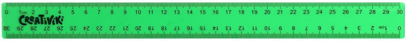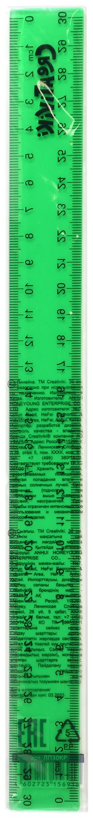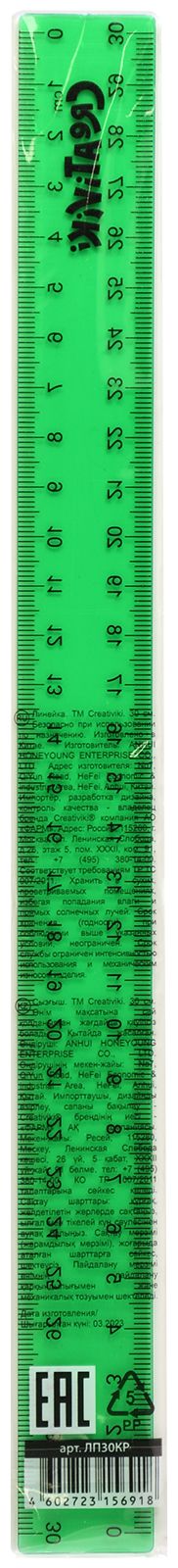 Линейка Creativiki выполнена из прочного прозрачного пластика универсального зеленого цвета. Оптимальной длины 30 см хватит для комфортного пользования и черчения самых длинных линий.