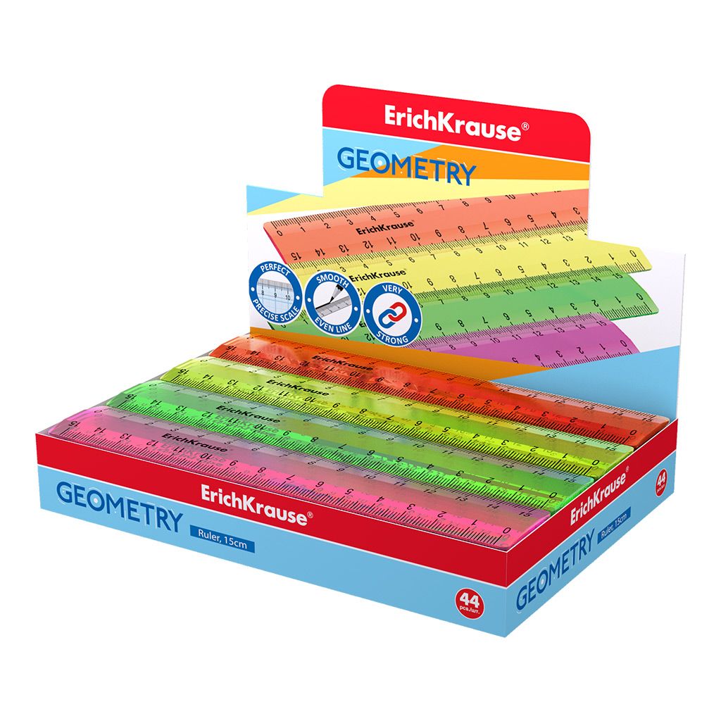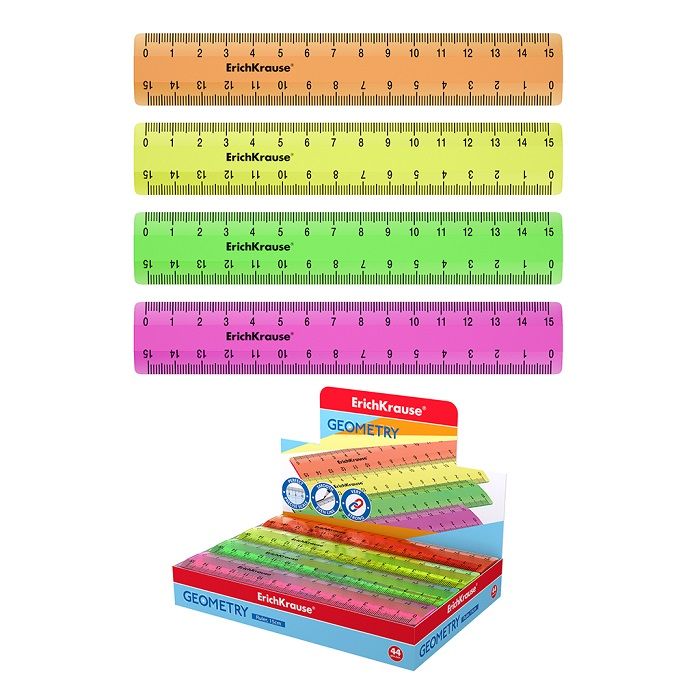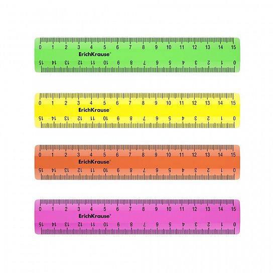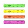 Линейка из высококачественного пластика с двухсторонней шкалой. Ассорти из 4 ярких прозрачных неоновых цветов в коробке дисплее (розовый, оранжевый, желтый, зеленый). Точная миллиметровая шкала, длина разметки составляет 15 см.