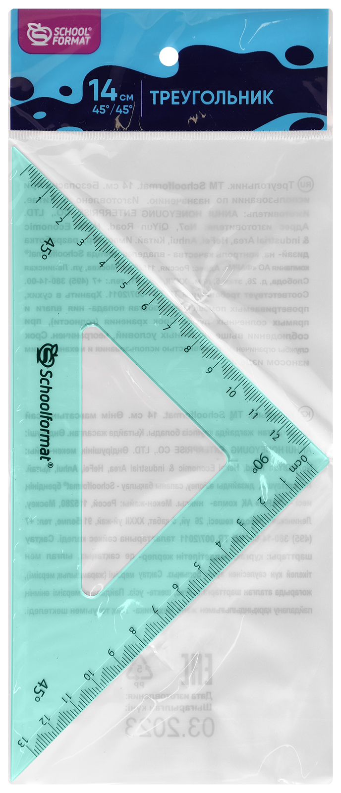 Цвет: ассорти Наличие европодвеса: Да Вид чертежных принадлежностей: Треугольник Градусы: 45 Материал: пластик Прозрачность материала: тонированный Мин. партия и варианты упаковок: 1 / 120 / 1200 -