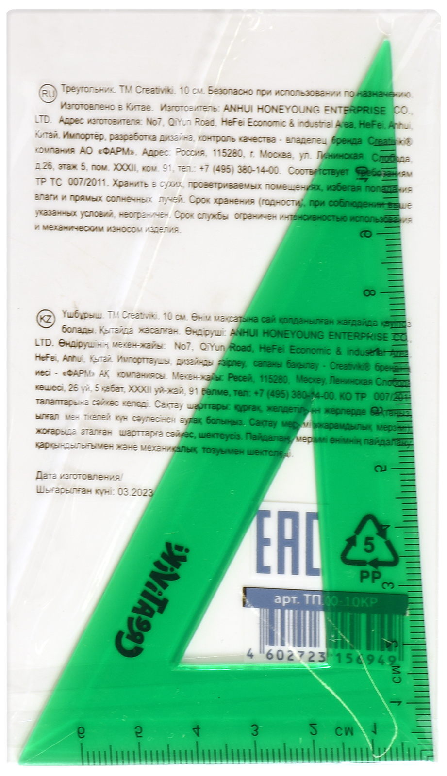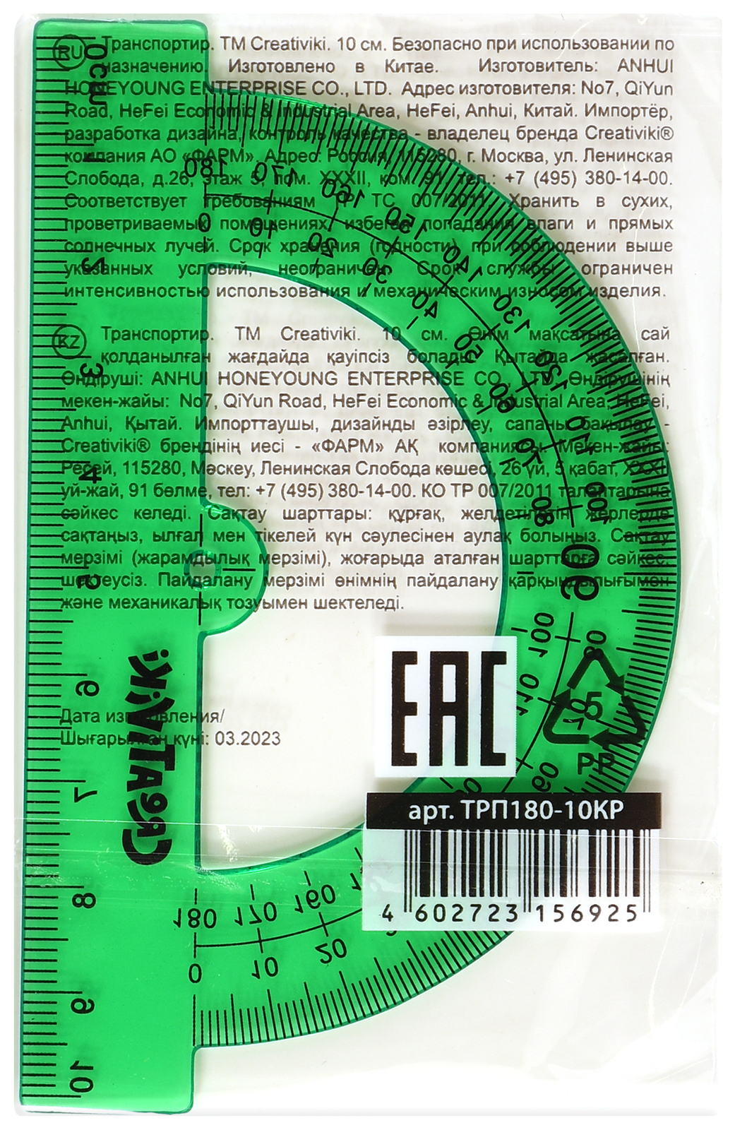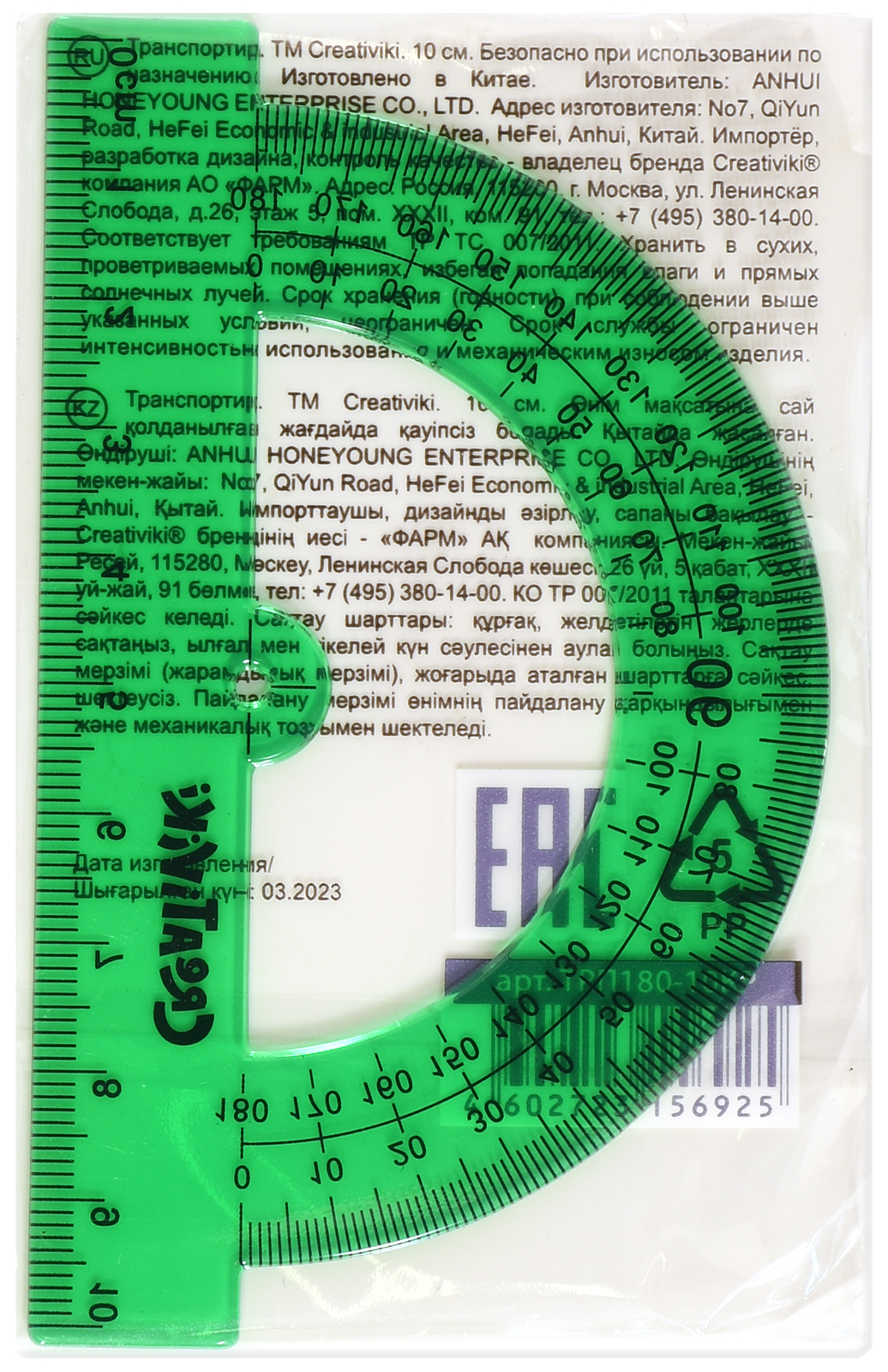 Цвет: зеленый Наличие европодвеса: Нет Вид чертежных принадлежностей: Транспортир Материал: пластик Прозрачность материала: тонированный Торговая марка: Creativiki Мин. партия и варианты упаковок: 1 / 48 / 2880 -