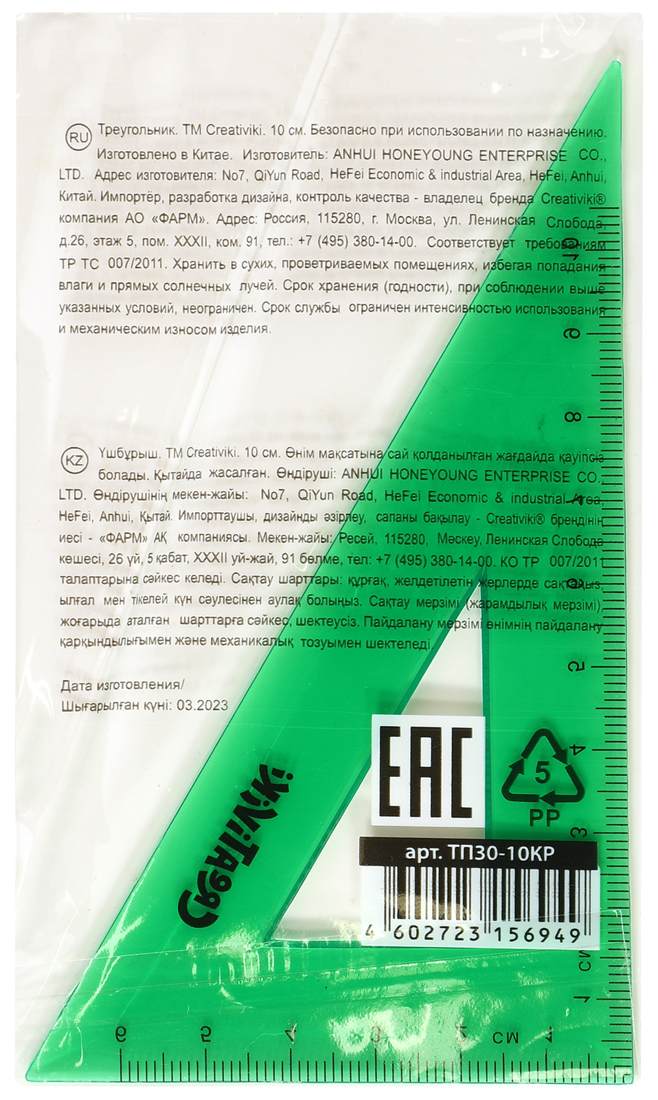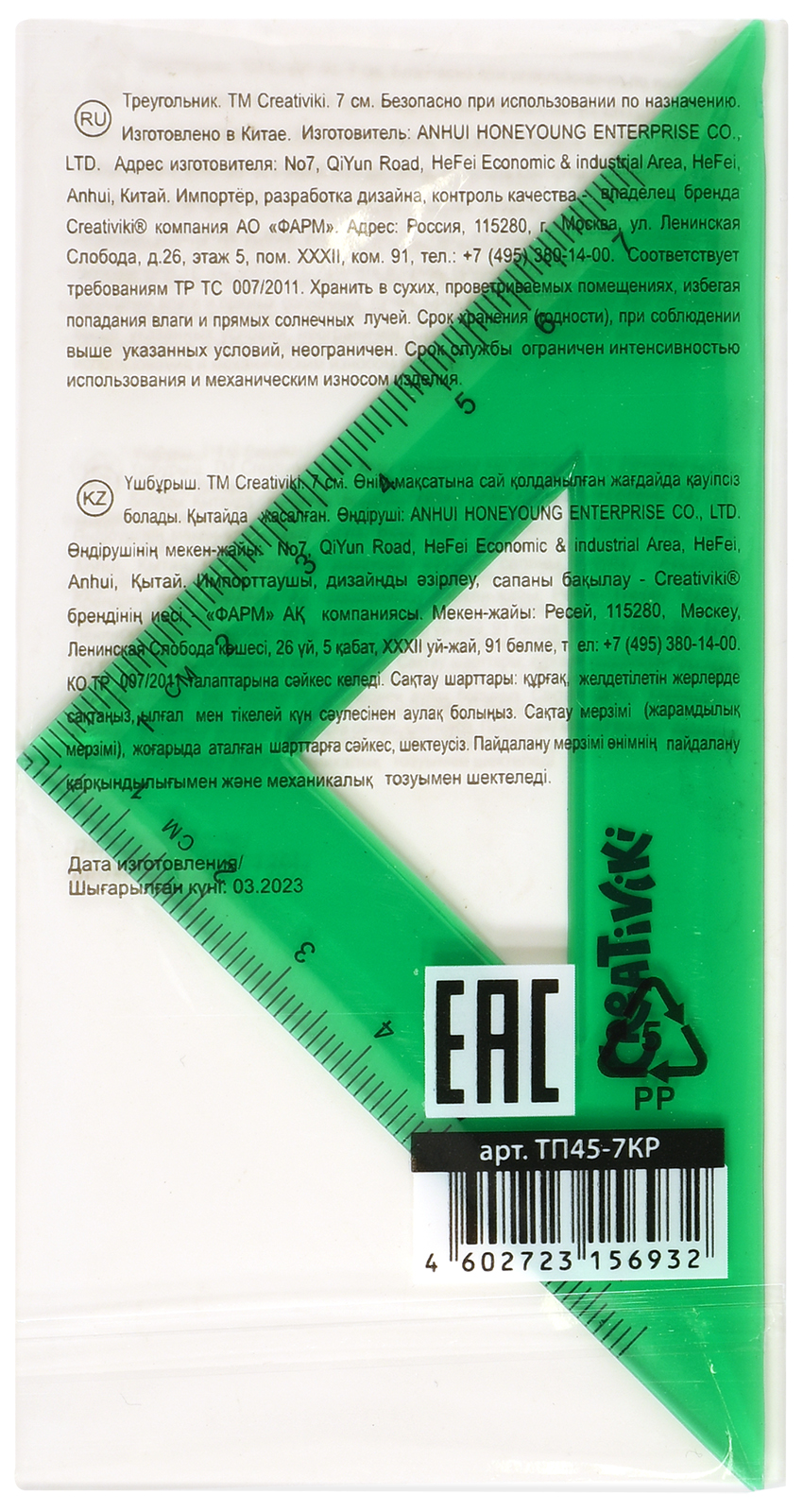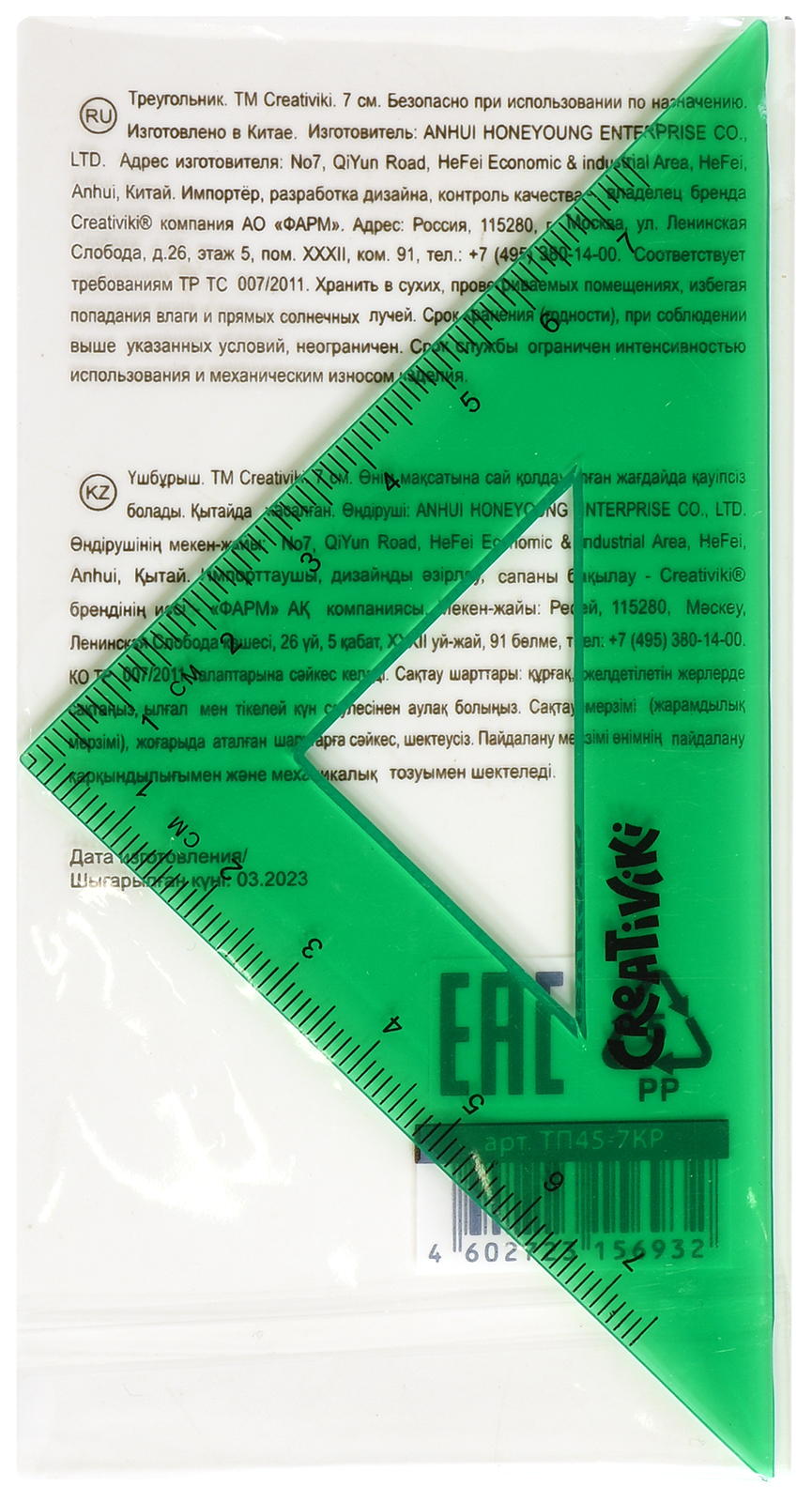 Цвет: зеленый Наличие европодвеса: Нет Вид чертежных принадлежностей: Транспортир Материал: пластик Прозрачность материала: тонированный Торговая марка: Creativiki Мин. партия и варианты упаковок: 1 / 48 / 2880 -