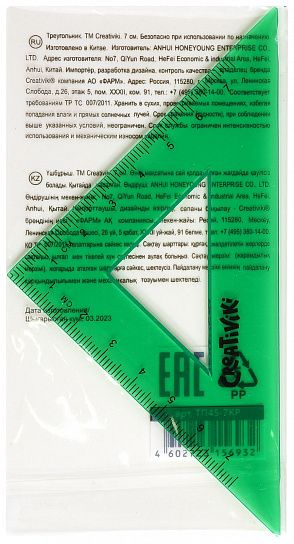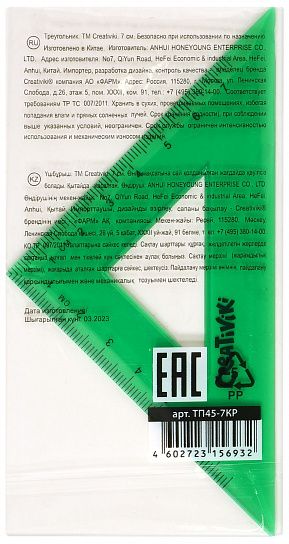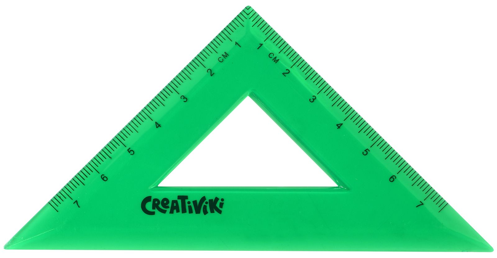 Треугольник Creativiki изготовлен из прочного прозрачного пластика универсального зеленого цвета с односторонней миллиметровой шкалой. Угол треугольника - 45 градусов. Длина миллиметровой шкалы - 7 см.