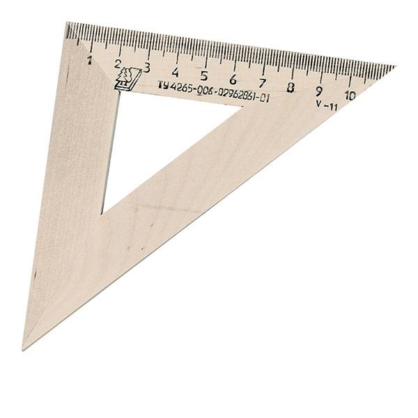 Размер треугольника: длина шкалы - 110 мм, угол - 45°. Равнобедренный угольник с прямым углом изготовлен из твердолиственных пород древесины, имеют износостойкую одностороннюю шкалу.
