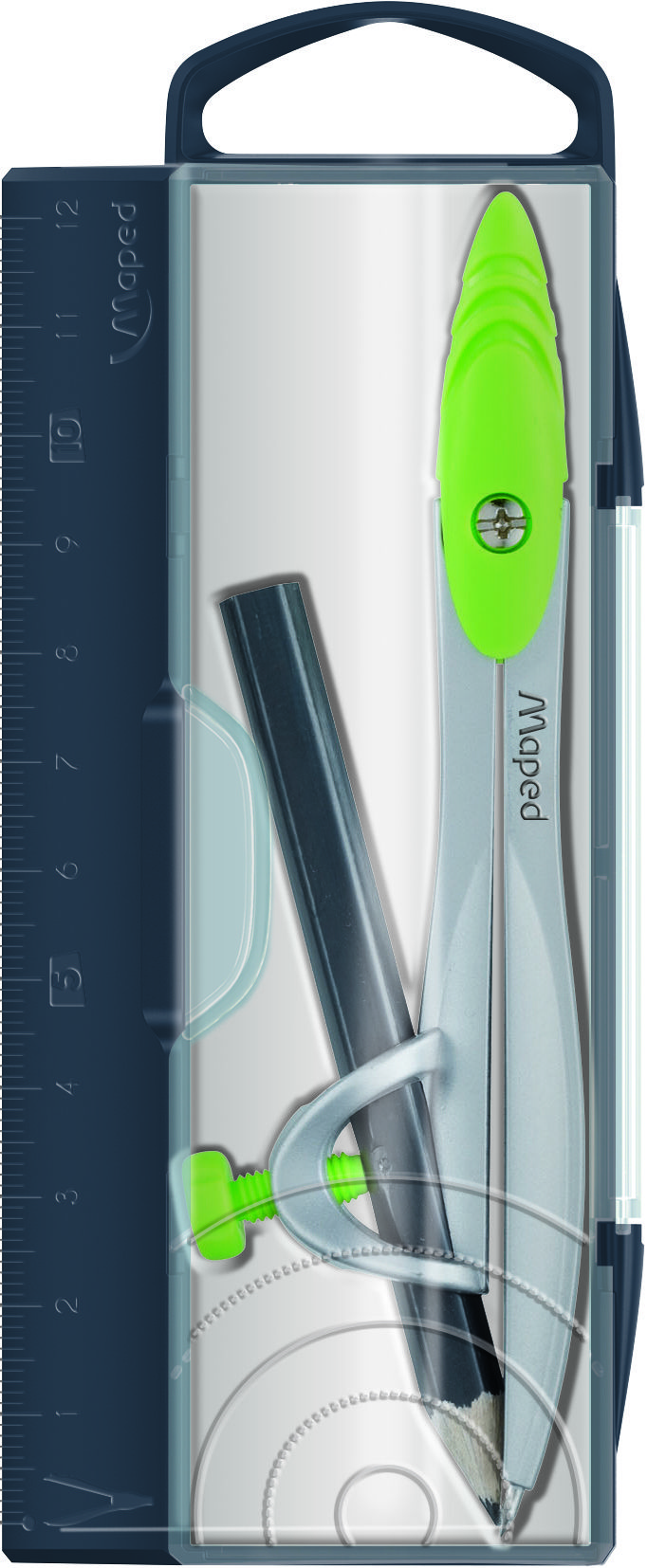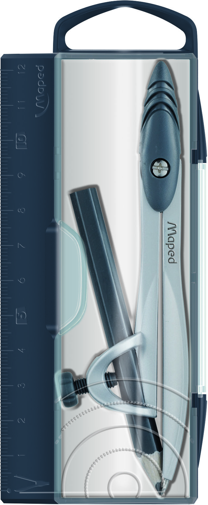 Наличие европодвеса: Нет Упаковка: пластиковый чехол Вид чертежных принадлежностей: Циркуль Материал: металл Безопасная игла: Нет Защитный колпачок для иглы: Нет Мин. партия и варианты упаковок: 1 / 20 / 240 Циркуль MAPED STUDY из цинкового сплава, с эргономичной головкой, с грифелем, в пластиковом футляре, в комплекте пенал с доп грифелем, сереб