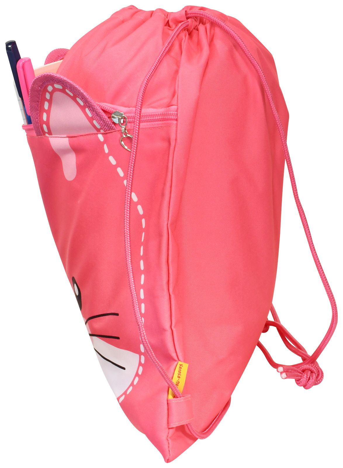 Цвет: розовый Размер: 38x38 см Материал: полиэстер Вид изделия: Мешок для обуви Количество секций: 1 отделение Пол ребенка: для девочек Мин. партия и варианты упаковок: 1 / 100 Мешок для обуви Каляка-Маляка КОШКА 38x38 см, розовый, 1 отделение, с большим карманом на молнии, для девочек