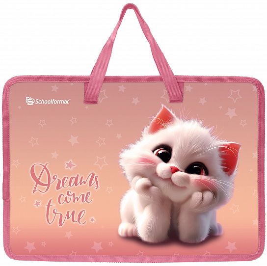 Папка д/труда с 2 ручками А4 широкая Schoolformat МЕЧТАТЕЛЬНЫЕ КОТЯТА 330х260х75 мм персик. пластик, полиэстер молния сверху @ д/девочек