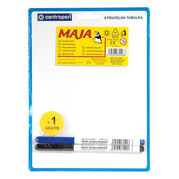 Набор содержит двустороннюю доску для рисования с белой поверхностью, а также маркер. Имеется отверстие для подвешивания. Обратная сторона в линейку