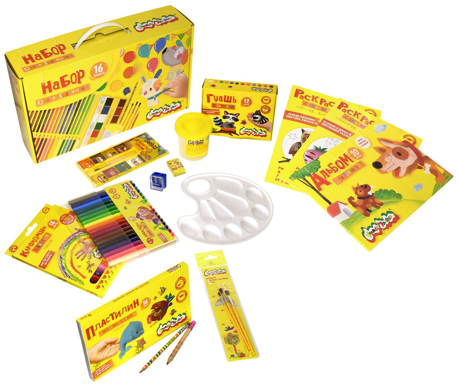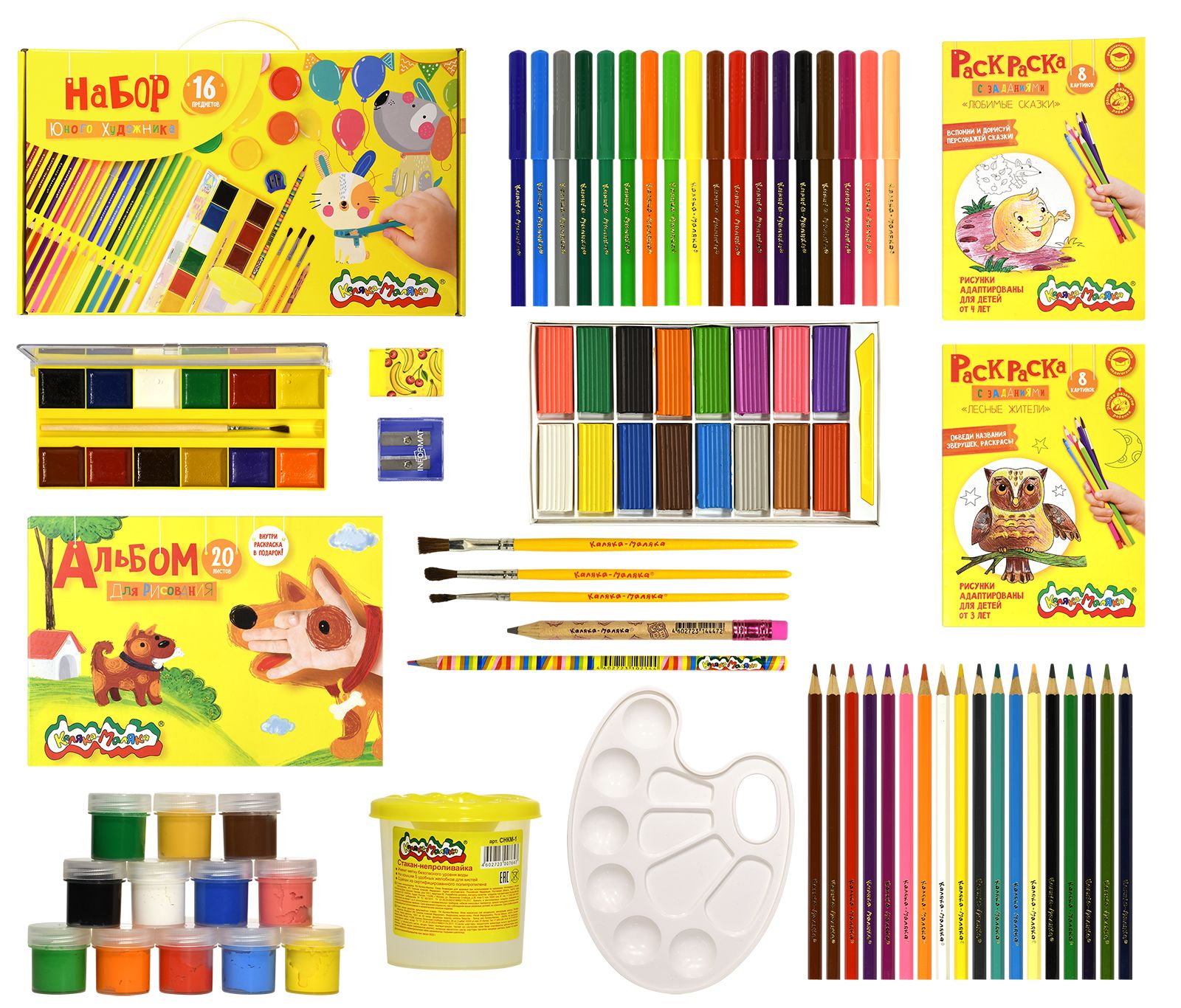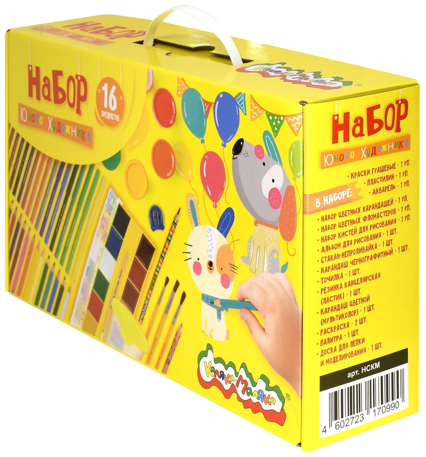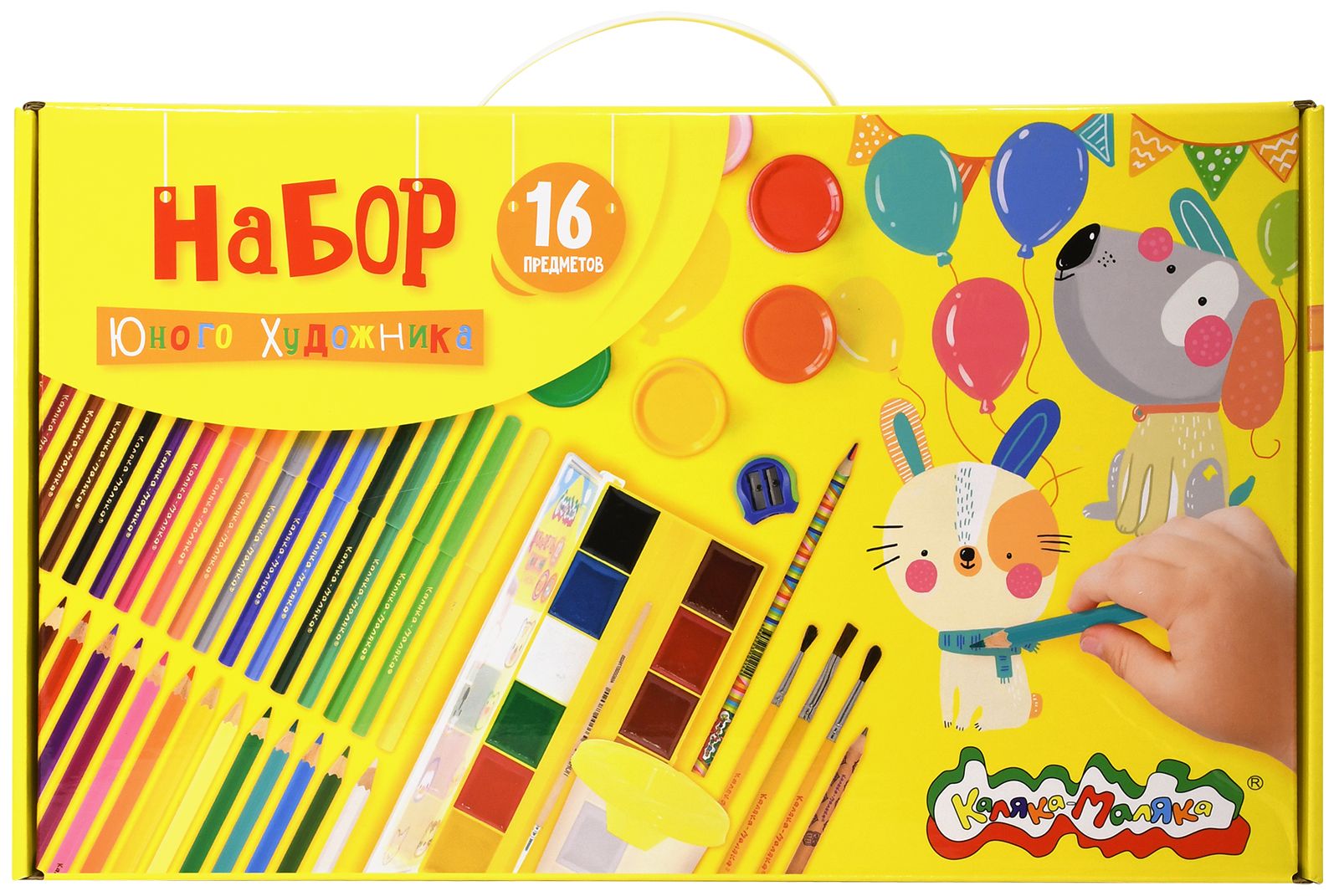 Размер: 360х220х90 мм Количество предметов: 16 Цвет корпуса: дизайн Вид товара для учебы: Набор для творчества Пол ребенка: универсальный Материал короба/портфеля: микрогофрокартон Мин. партия и варианты упаковок: 1 / 6 Набор для творчества в подарочной коробке Каляка-Маляка НАБОР ЮНОГО ХУДОЖНИКА 16 предметов 360х220х90 мм