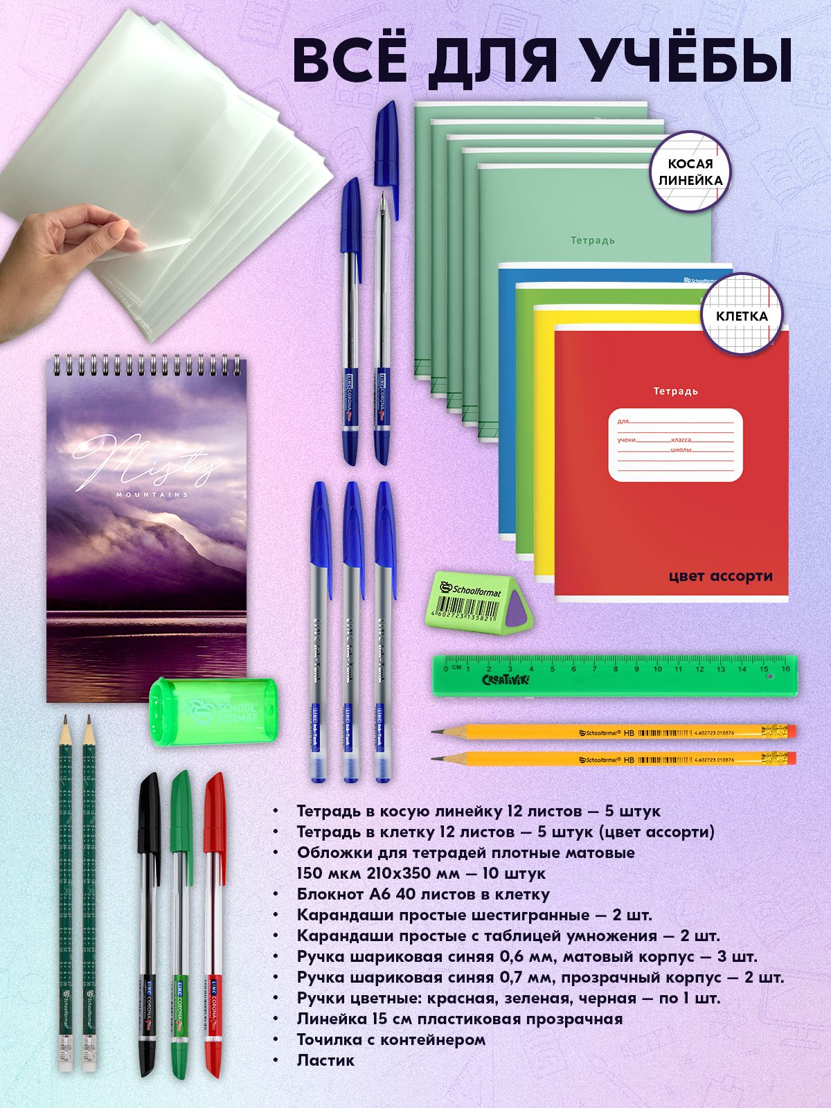 Размер: 360х220х90 мм Количество предметов: 50 Цвет корпуса: дизайн Вид товара для учебы: Набор для школьника Пол ребенка: универсальный Материал короба/портфеля: микрогофрокартон Мин. партия и варианты упаковок: 1 / 6 -