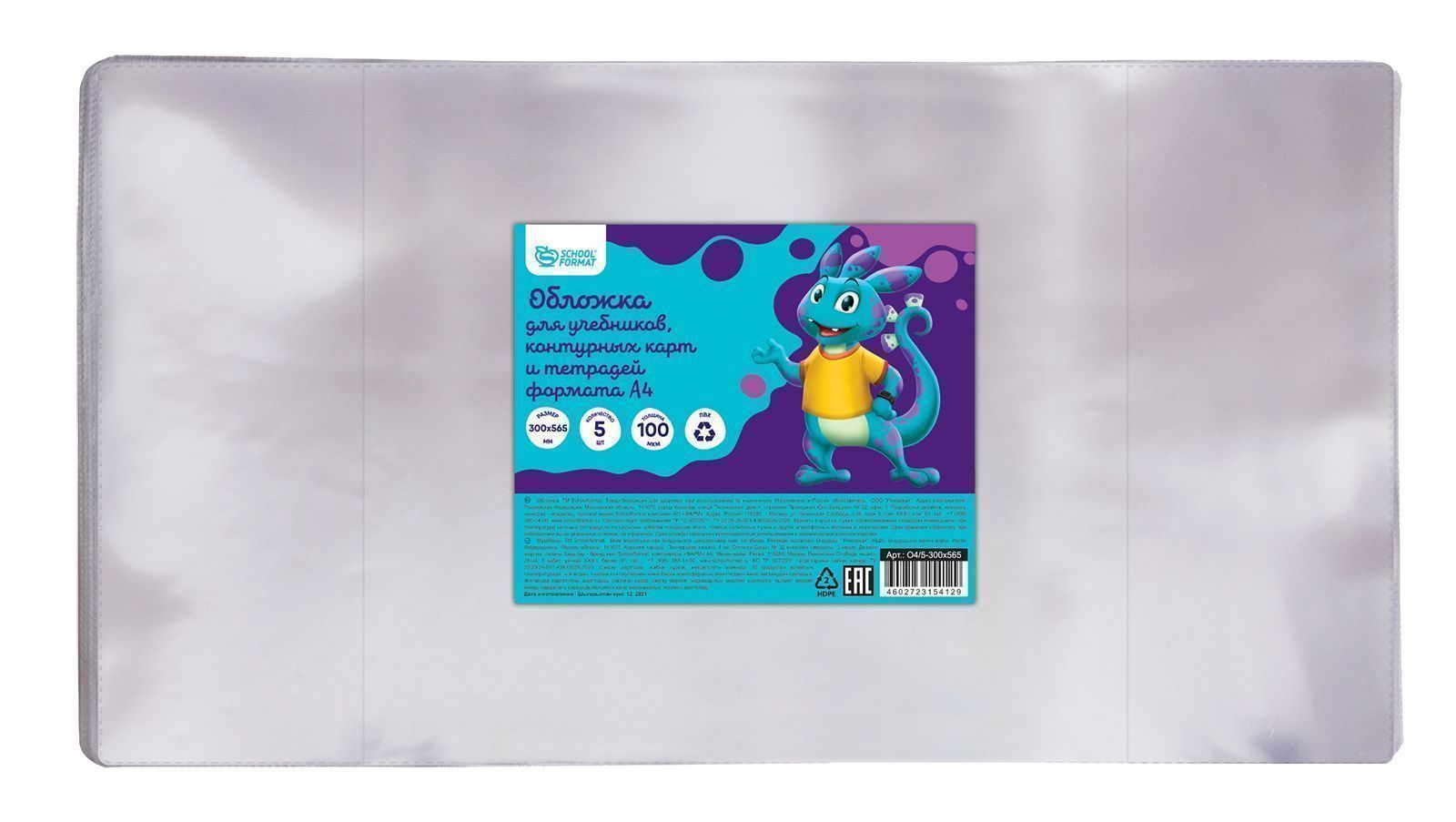 Обложки упакованы по 5 штук. Также упаковка сопровождается привлекательным цветным вкладышем. На каждой обложке имеется индивидуальный штрих-код. Имеет универсальный размер, который можно легко отрегулировать по ширине учебника.