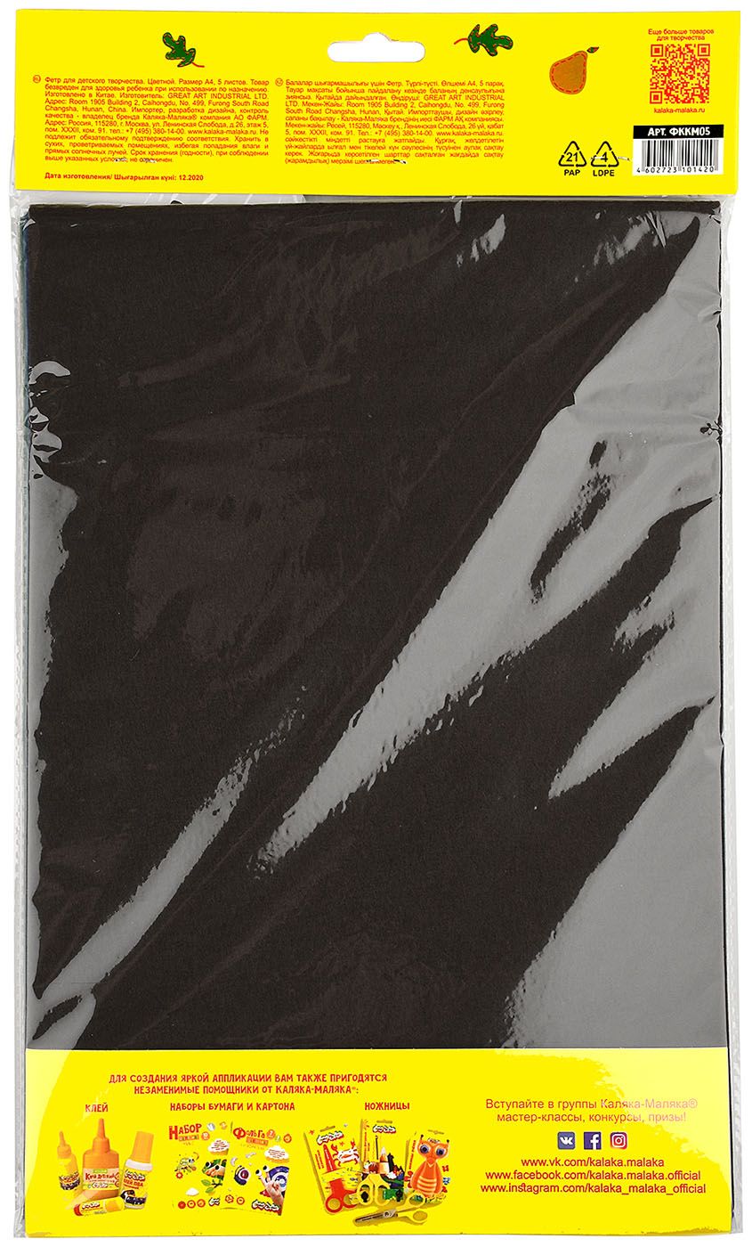 Формат: А4 Количество листов: 5 Количество цветов: 5 Наличие европодвеса: Да Упаковка: пакет Вид материала для творчества: Фетр Мин. партия и варианты упаковок: 1 / 200 -