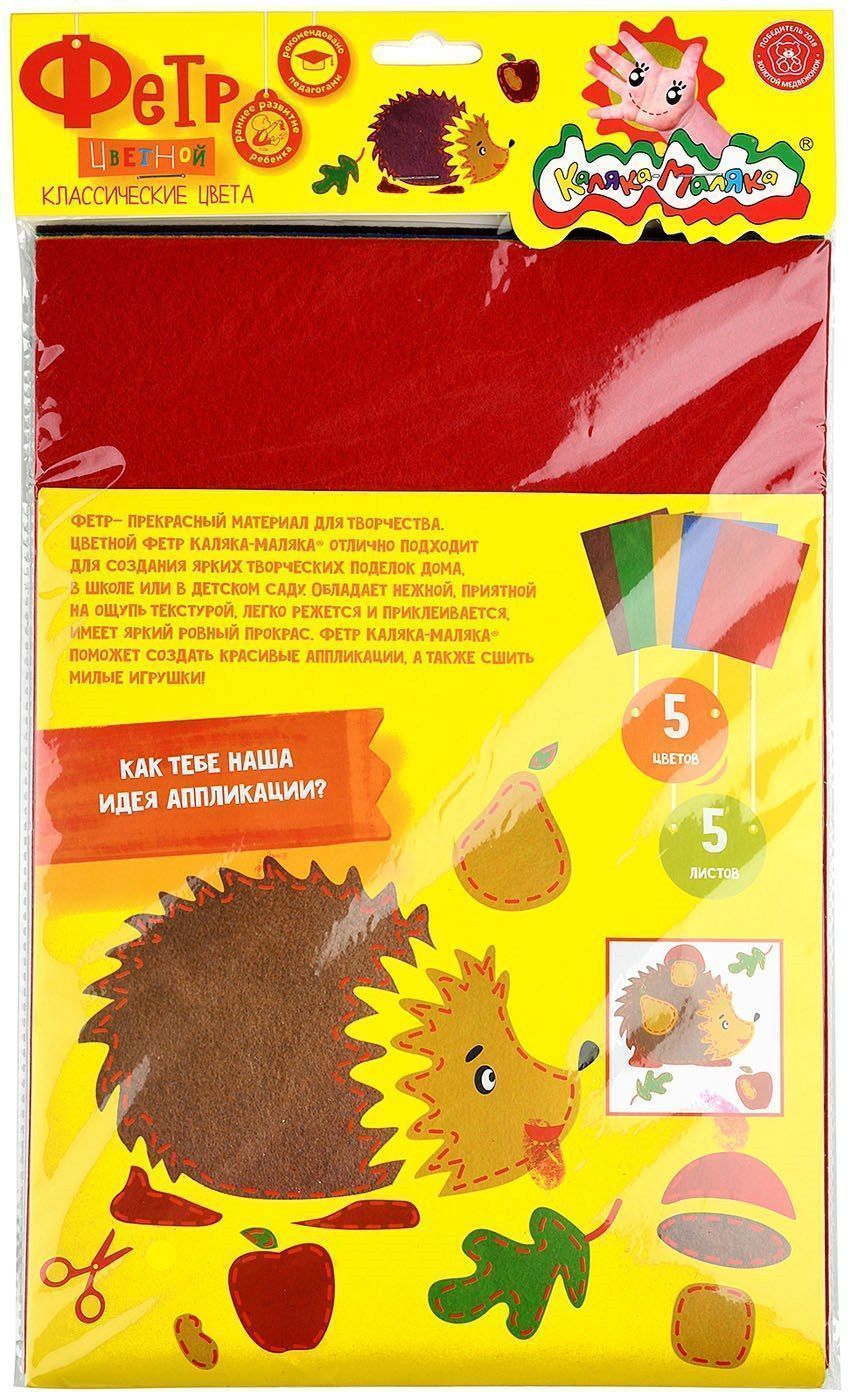 Высокое качество прокраса листов фетра. Не пачкает руки. Можно клеить и декорировать любые детские поделки. В наборы с цветным фетром входят: 5 листов и 5 цветов фетра формата А4.