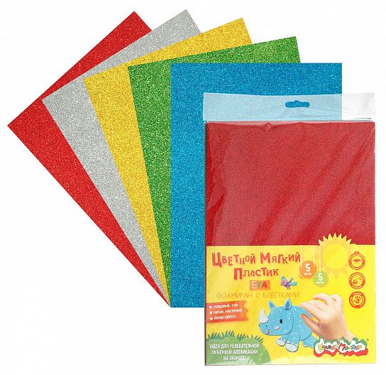 Хорошо режется ножницами, клеится клеем, кроме того, по нему можно рисовать фломастерами. Высокое качество прокраски, насыщенные оттенки. В наборе цвета: красный, жёлтый, голубой, зелёный, серебристый.