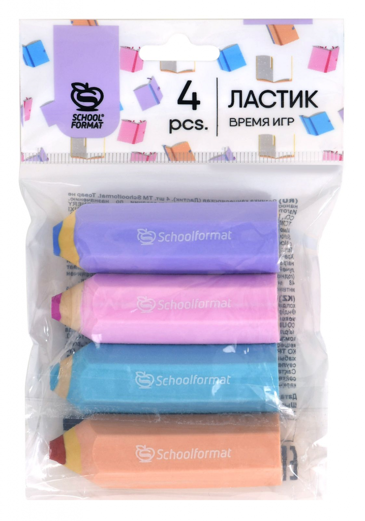 Набор ластиков Schoolformat ВРЕМЯ ИГР, термопластичная резина, 65х15х15 мм фигурный, ассорти, мягкий, 4 шт в пакете