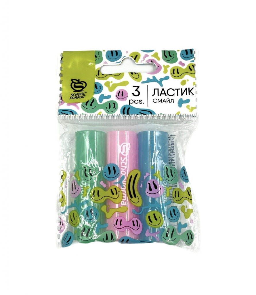 Набор ластиков Schoolformat СМАЙЛ ПВХ 55х16х16 мм цилиндрический, ассорти, мягкий, индивидуальный ШК, 3 шт в пакете