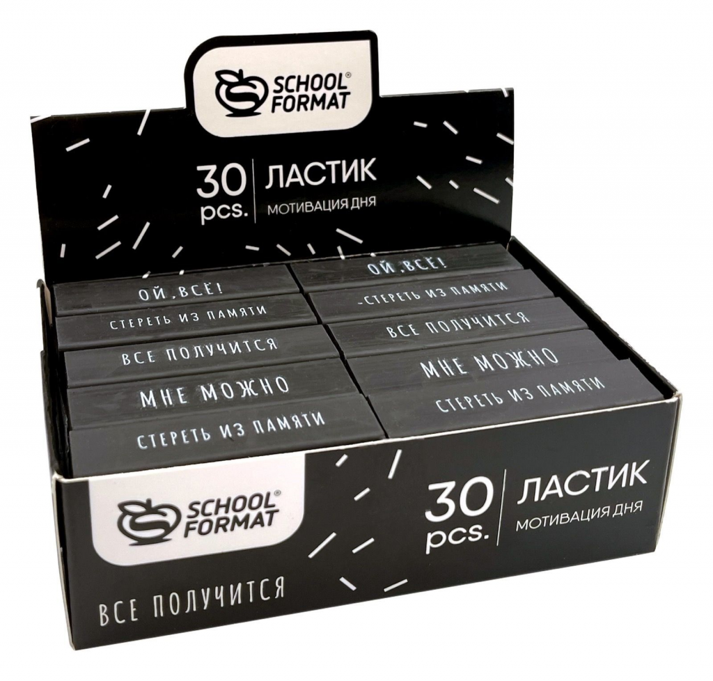 Ластик Schoolformat МОТИВАЦИЯ ДНЯ, термопластичная резина, 55х15х12 мм прямоугольный, черный, мягкий, индивидуальный ШК