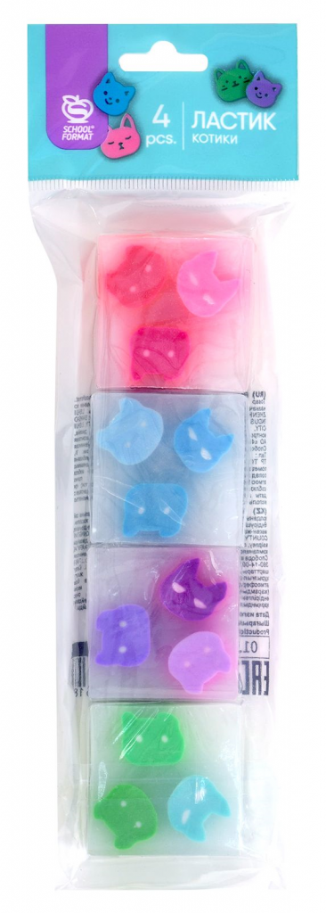 Набор ластиков Schoolformat КОТИКИ, ПВХ, 34х34х14 мм прямоугольный, ассорти, мягкий, 4 шт в пакете