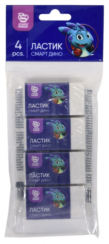 Набор ластиков Schoolformat СМАРТ ДИНО, термопластичная резина, 38х20х10 мм прямоугольный, белый, мягкий, картонный держатель, 4 шт в пакете