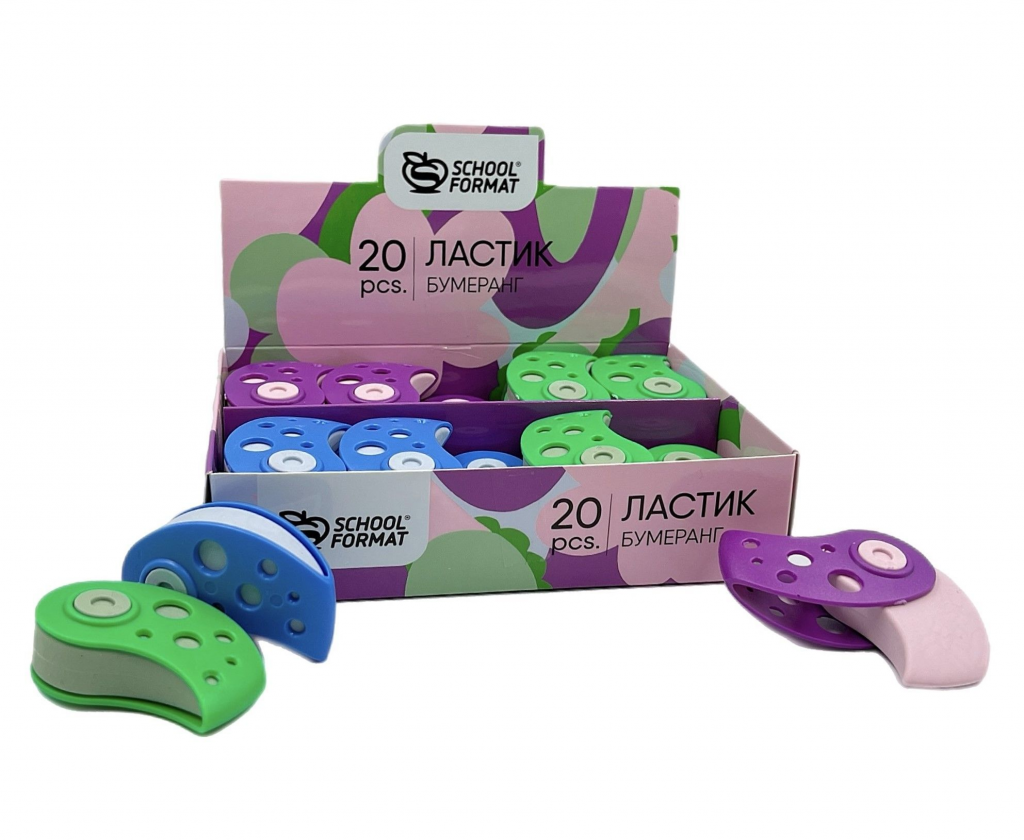 Ластик Schoolformat БУМЕРАНГ, термопластичная резина, 50х32х18 мм фигурный, ассорти, мягкий, пластиковый держатель, индивидуальный ШК