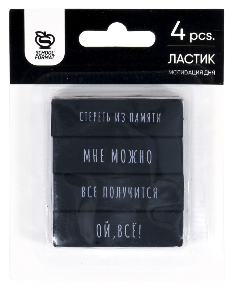 Набор ластиков Schoolformat МОТИВАЦИЯ ДНЯ, термопластичная резина, 55х15х12 мм прямоугольный, черный, мягкий, 4шт в пакете