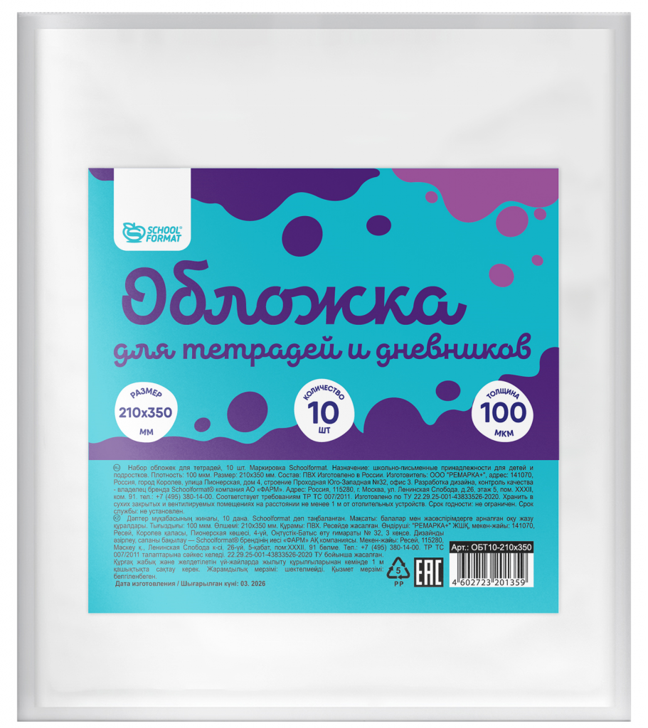 Размер: 210×350 мм (для стандартных школьных тетрадей).