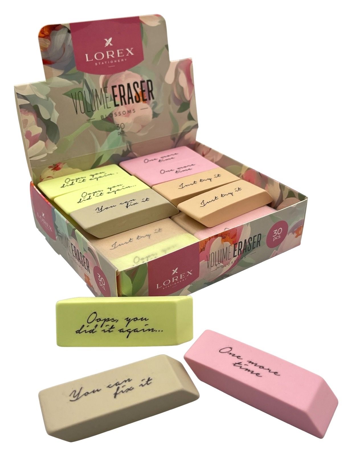 Цвет: ассорти Размер: 60х20х10 мм Наличие европодвеса: Да Упаковка: блистер Вид чертежных принадлежностей: Набор ластиков Материал: термопластичная резина Мин. партия и варианты упаковок: 1 / 12 / 288 Набор ластиков LOREX VOLUME ERASER BLOSSOMS, термопластичная резина, 60х20х10 мм скошенный, ассорти, мягкий, 4 шт в блистере
