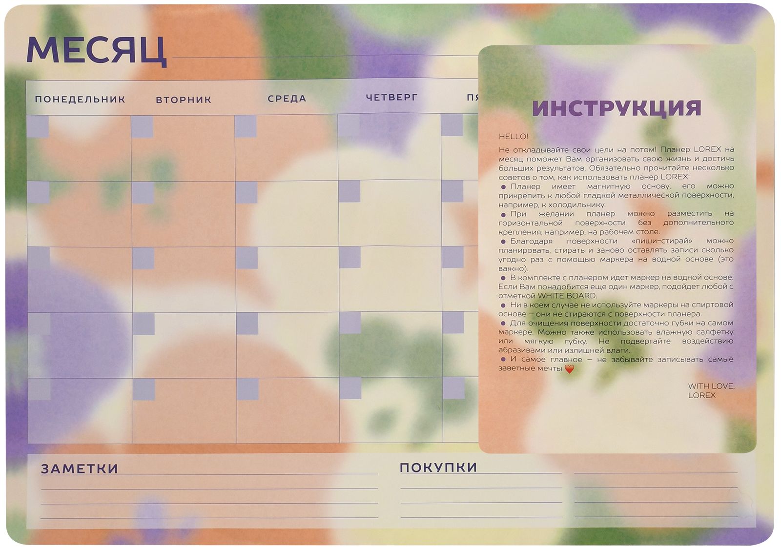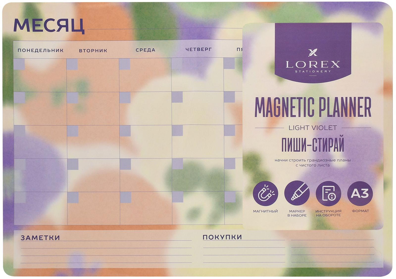 Формат: А3 Материал: картон, магнитный винил Серия: LIGHT VIOLET Торговая марка: LOREX Размер (ДхШ), мм: 297 х 420 мм Плотность картона, г/м2: 200 Мин. партия и варианты упаковок: 1 / 50 Планер магнитный на месяц LOREX LIGHT VIOLET А3 297 х 420 мм с маркером