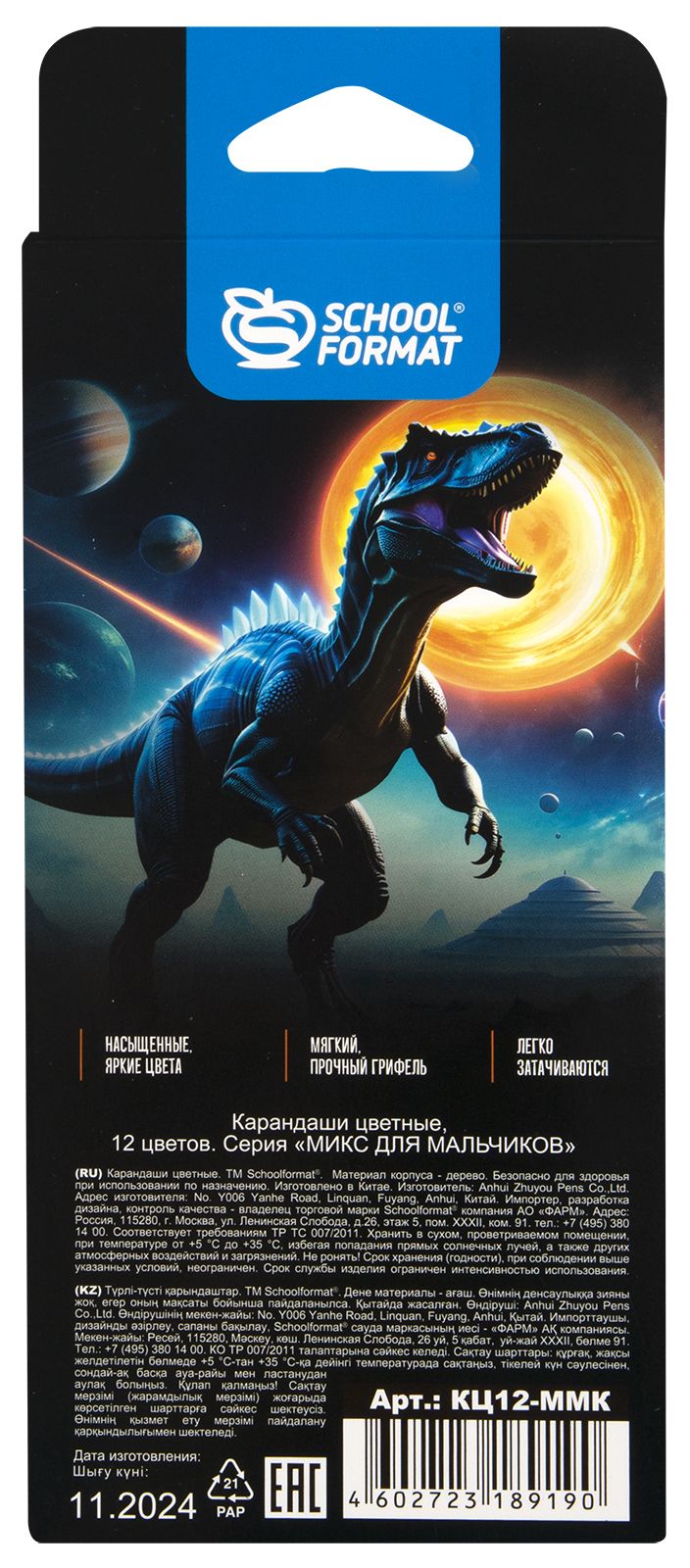 Материал: дерево Количество цветов: 12 Наличие европодвеса: Да Упаковка: картонная упаковка Мягкость грифеля: 2М-4М Вид товара: Набор цветных карандашей Мин. партия и варианты упаковок: 1 / 12 / 240 Набор цветных карандашей Schoolformat МИКС ДЛЯ МАЛЬЧИКОВ 12 цв. шестигранные, деревянные, в картонной упаковке