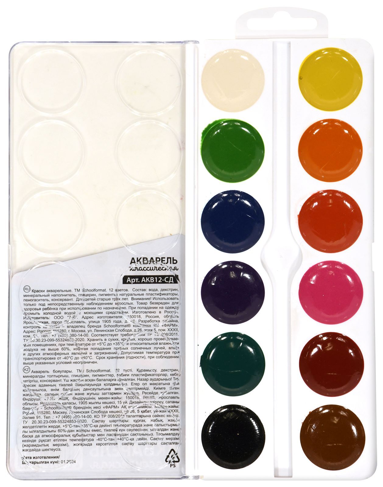 Количество цветов: 12 Наличие европодвеса: Да Упаковка: пластиковая упаковка Наличие кисти: без кисти Тип товара: детские Серия: Smart Dino Мин. партия и варианты упаковок: 1 / 40 Акварель Schoolformat Smart Dino 12 цветов, без кисти, пластиковая упаковка с европодвесом