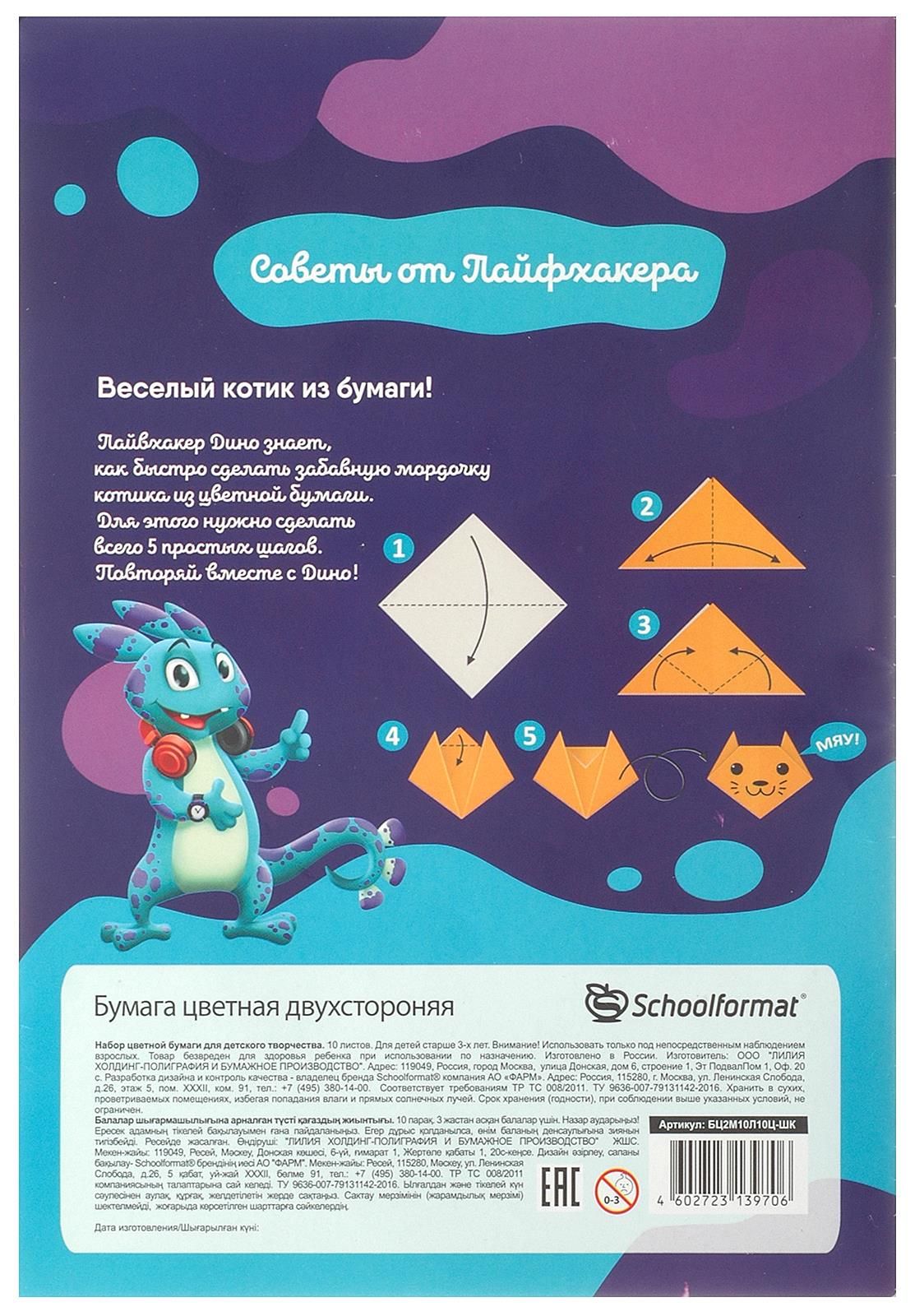 Формат: А4 Плотность, г/м2: 60 Количество листов: 10 Вид продукции для творчества: Бумага цветная Количество цветов: 10 Наличие европодвеса: Нет Мин. партия и варианты упаковок: 1 / 40 Бумага цветная 2-стор. Schoolformat мелованная 10 л. 10 цв. 60 г/м2 на скрепке