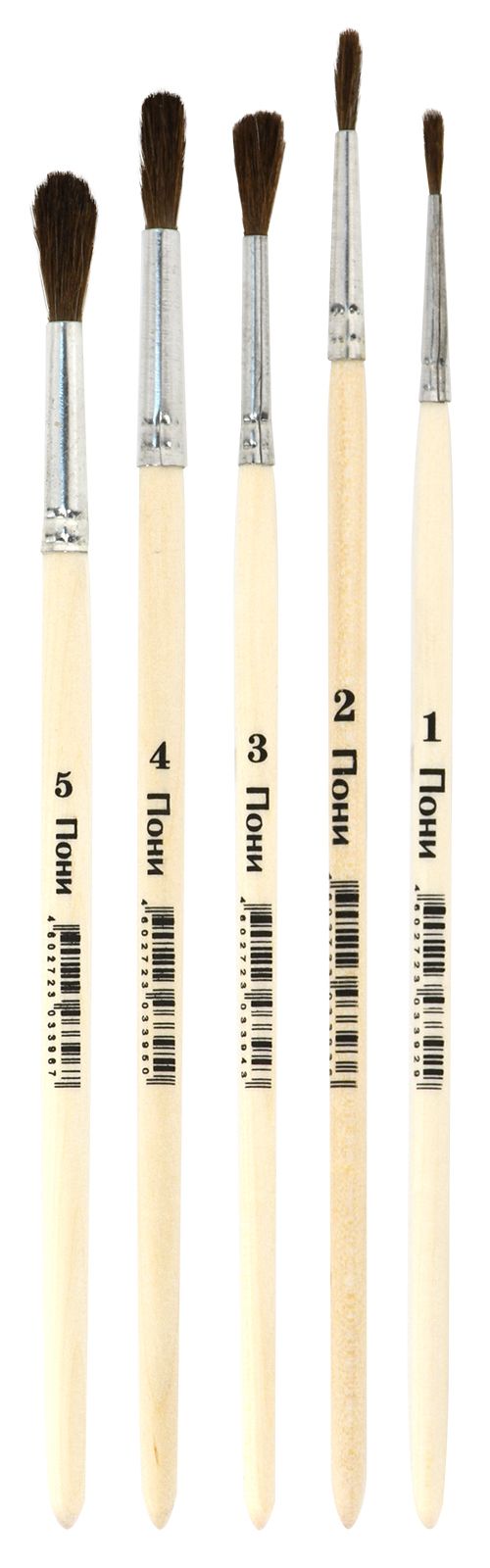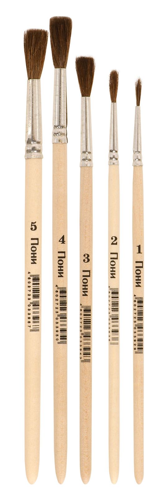 Количество в упаковке, шт: 5 Вид товаров: Набор кистей Ворс: пони Наличие европодвеса: Да Упаковка: пакет Комплектность набора кистей: № 1,2,3,4,5 круглые - пони Мин. партия и варианты упаковок: 1 / 30 / 300 -
